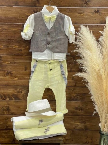 Γιλέκο μπεζ, λευκό πουκάμισο λινό και buggy κίτρινο λινό παντελόνι, καπέλο, σετ λαδόπανα κ εσώρουχα.