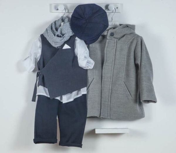 Χειμωνιάτικα βαπτιστικά ρούχα για αγόρι της εταιρείας Bambolino που αποτελείται από γκρι-μπλε παντελόνι, ίδιας απόχρωσης γιλέκο και λευκό πουκάμισο. Συνοδεύεται από γκρι φουλάρι και μπλε καπέλο τραγιάσκα.