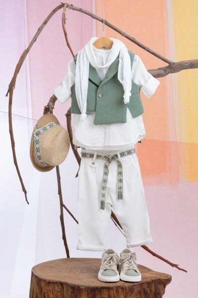 Ο Kleomenis είναι ένα ιδιαίτερα chic σετ από βαπτιστικά ρούχα για αγόρι. Αποτελείται από εκρού παντελόνι με πιέτες, εκρού πουκάμισο με πουά μέντα σχέδιο και πράσινο γιλέκο εξαιρετικής ποιότητας. Αξεσουάρ είναι η πράσινη τρέσα για ζώνη, το φουλάρι και το καβούρι του.
