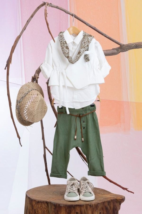 Ο Mathios είναι ένα μοναδικό βαπτιστικό ρούχο για αγόρι, που αποτελείται από πράσινο παντελόνι τύπου λινάρι εξαιρετικής ποιότητας, εκρού λινό πουκάμισο και νέο εκρού γιλέκο με φοβερή εφαρμογή και στυλ. Αξεσουάρ είναι το κορδόνι για ζώνη, το μπεζ φουλάρι με σχέδιο και το ψάθινο καβούρι του.
