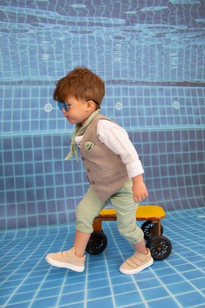Ο Renos είναι ένα baby chic σύνολο βάπτισης σε μπεζ και light green χρώμα. Αποτελείται από light green παντελόνι βαμ/ρο, εκρού petit πουά πουκάμισο και μπεζ γιλέκο από ψάθα εξαιρετικής ποιότητας. Αξεσουάρ το φουλάρι και το καβουράκι για το κεφάλι.