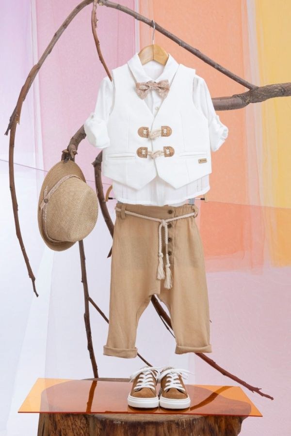 Ο Timos αποτελείται από japanese παντελόνι σε μία ιδιαίτερη απόχρωση της ώχρας, εκρού πουκάμισο εξαιρετικής ποιότητας και εκρού γιλέκο το οποίο είναι διακοσμημένο με chic δεσίματα που του προσδίδουν ένταση και κομψότητα. Αξεσουάρ είναι το παπιγιόν, το κορδόνι για ζώνη και το καβούρι του.