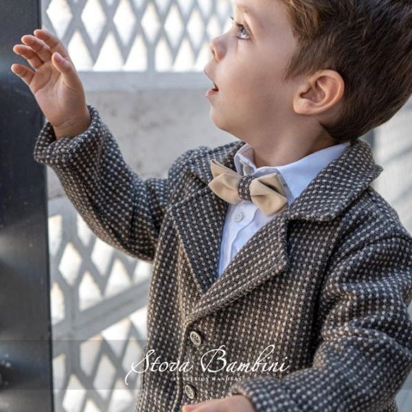 Κοστούμι με ολοκαίνουριο Jacket Stova Bambini, από δίχρωμη ψιλόριγη πλέξη μαλλιού σε αποχρώσεις πούρου και σκούρο (mustard) μπεζ. Αποτελείται από 7 τεμάχια σε μοναδικό συνδυασμό σκούρο (mustard) μπεζ γιλέκο και παντελόνι 100% βαμβακερό. Έχει λευκό βαμβακερό πουκάμισο και στο σετ περιλαμβάνονται ζώνη ιμάντας καθώς επίσης υφασμάτινο παπιγιόν και τραγιάσκα.