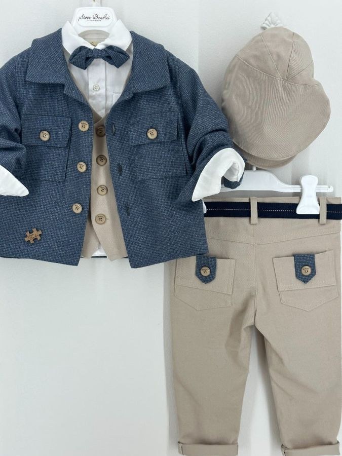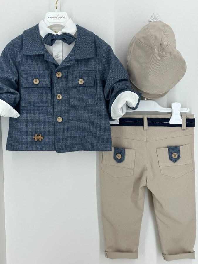 Μοντέρνο Jacket Stova Bambini, από βαμβακερό ύφασμα δίχρωμης απόχρωσης μπλε και γκρι, αποτελούμενο από 7 τεμάχια σε αγαπημένο συνδυασμό μπεζ γιλέκου και παντελονιού 100% βαμβακερά. Το σετ περιλαμβάνει λευκό βαμβακερό πουκάμισο, ζώνη ιμάντα καθώς επίσης υφασμάτινο παπιγιόν και τραγιάσκα.