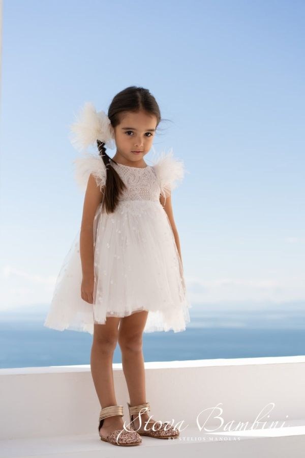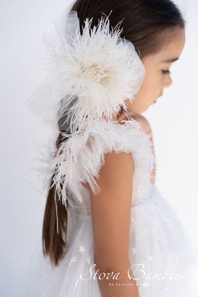 Βαπτιστικά ρούχα για κορίτσι. Το νέο φόρεμα της Stova Bambini με πούπουλα μαραμπού, στην σειρά φορεμάτων από βαπτιστικά ρούχα που δημιούργησαν τάση στη βάπτιση. Το κορσάζ αποτελείται από διακοσμητική, κερωμένη δαντέλα με ανάγλυφα λουλούδια που καταλήγουν στην ζώνη και ακουμπούν αρμονικά στην φούστα δημιουργώντας μια luxury εμφάνιση! Τα μανίκια διακοσμούνται με πούπουλα μαραμπού και στην πλάτη υπάρχει διακοσμητικό κούμπωμα - μπουτουνιέρα από πούπουλα και πέρλες. Η φούστα αποτελείται από τούλι κεντημένο με καρδιές και αστεράκια. Εσωτερικά υπάρχει βαμβακερή, υποαλλεργική φόδρα και υποαλλεργικό βαμβακερό τούλι. Διατίθεται με ασορτί κορδέλα στα μαλλιά με δίχρωμα τριαντάφυλλα σε εκρου-ροζ και συνδυάζεται τέλεια με πέδιλα ή μπαλαρίνες Stova Bambini. Σχεδιάστε τη βάπτιση των ονείρων σας, κάθε ρούχο συνδυάζεται με ανάλογο φιόγκο για το κουτί ή την βαλίτσα σας, λαμπάδα, λαδόπανα, εσώρουχα, πετσέτες και σετ κολυμπήθρας (κεράκια-σαπούνι-μπουκάλι λαδιού), είτε διακοσμημένο και με το θέμα της επιλογής σας. Μέγεθος από 6 έως 36 μηνών, διαθέσιμο μεγεθολόγιο με διαστάσεις μωρού.