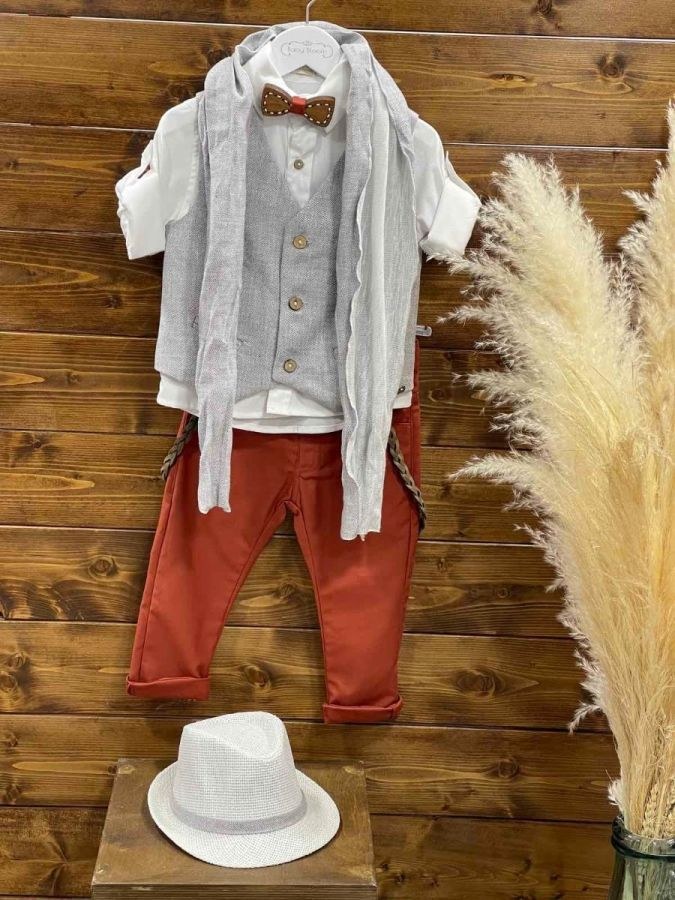 Βαπτιστικό ρούχο σακάκι λινό και ασορτί παντελόνι με λευκό πουκάμισο και παπιόν.