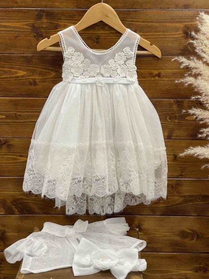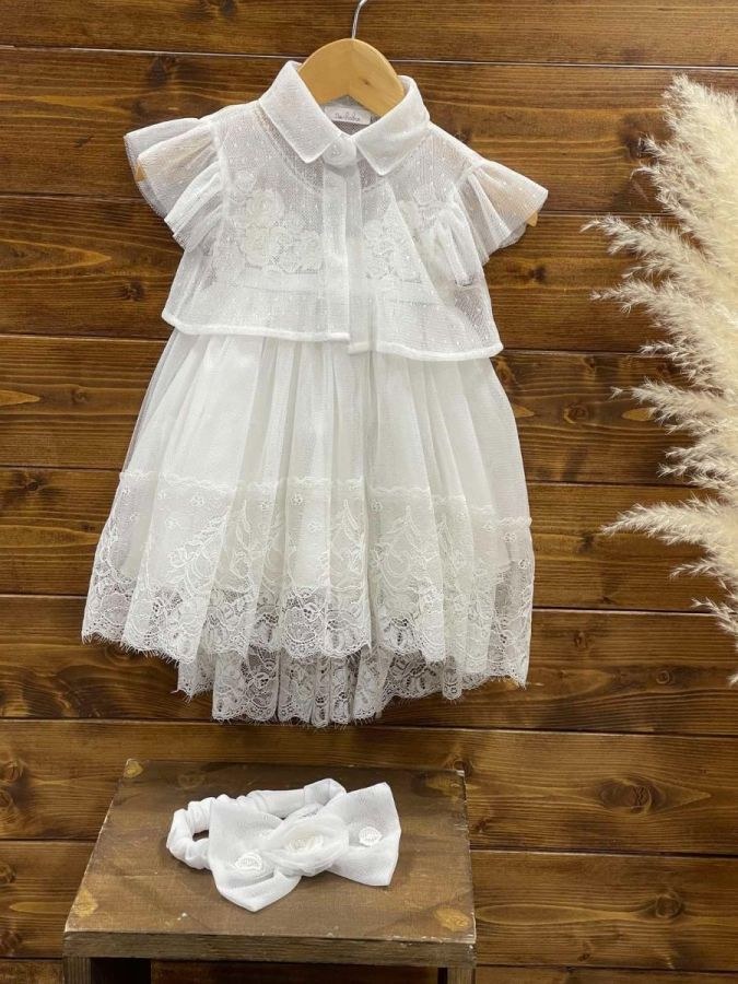 Βαπτιστικό φόρεμα τούλινο λευκό με δαντέλα και μπολερό τούλινο και κορδέλα.