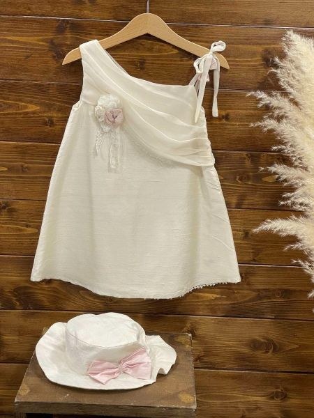 Βαπτιστικό φόρεμα off white ταντάς με 1 ώμο και καπέλο.