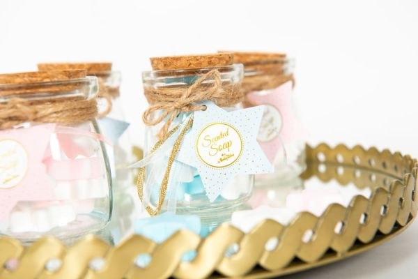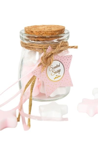 Μπομπονιέρα βαζάκι με σαπουνάκια αστεράκια ροζ & άσπρα. Διάσταση 7 x 5,5 εκ. 60gr.