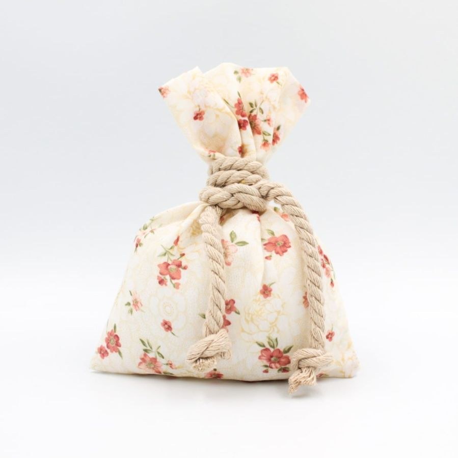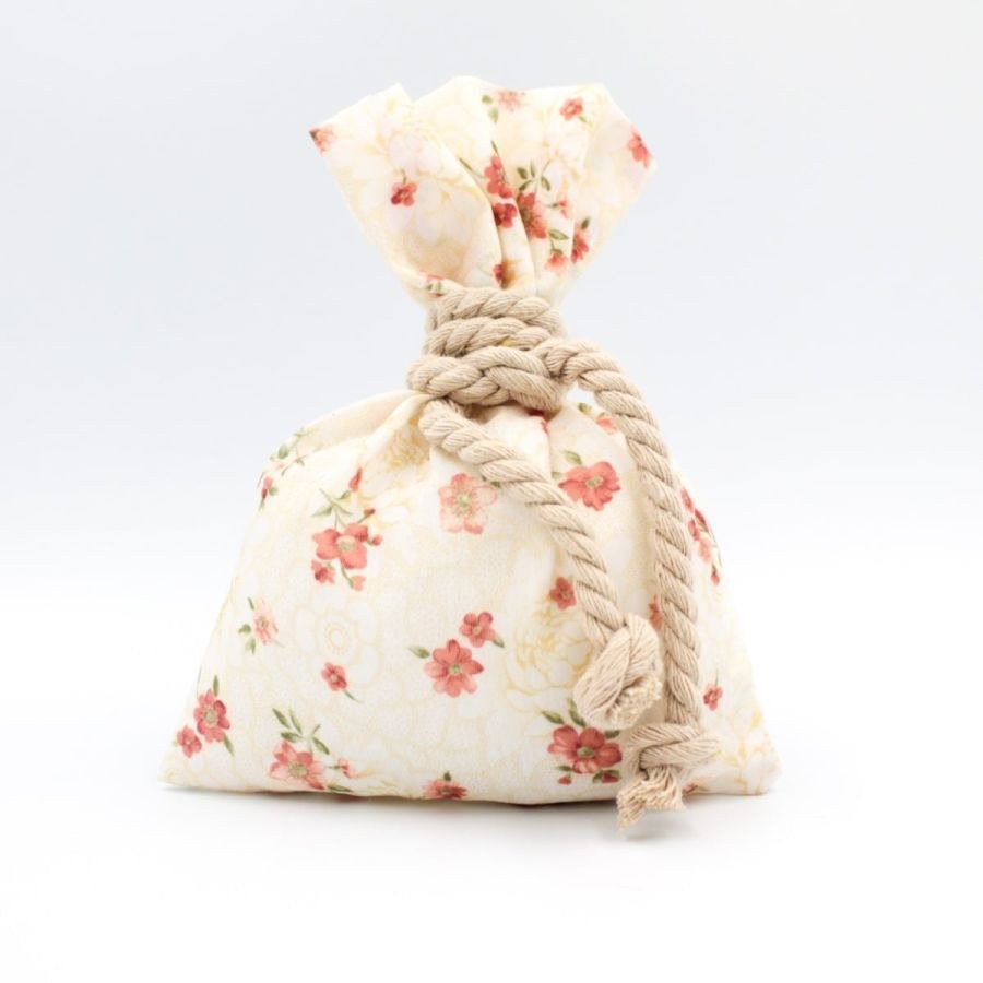 Μπομπονιέρα βάπτισης πουγκί floral με δέσιμο λαιμό με τρίκλωνο βαμβακερό μπεζ.