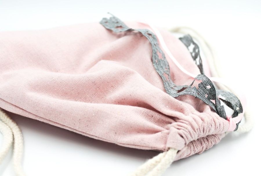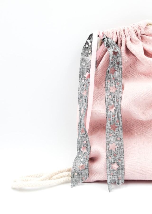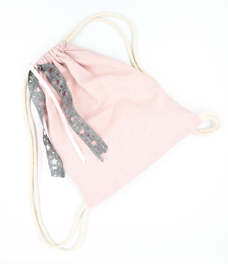 Μπομπονιέρα βάπτισης πουγκί πλάτης σε ροζ χρώμα με κορδέλα με γκρι αστεράκια.