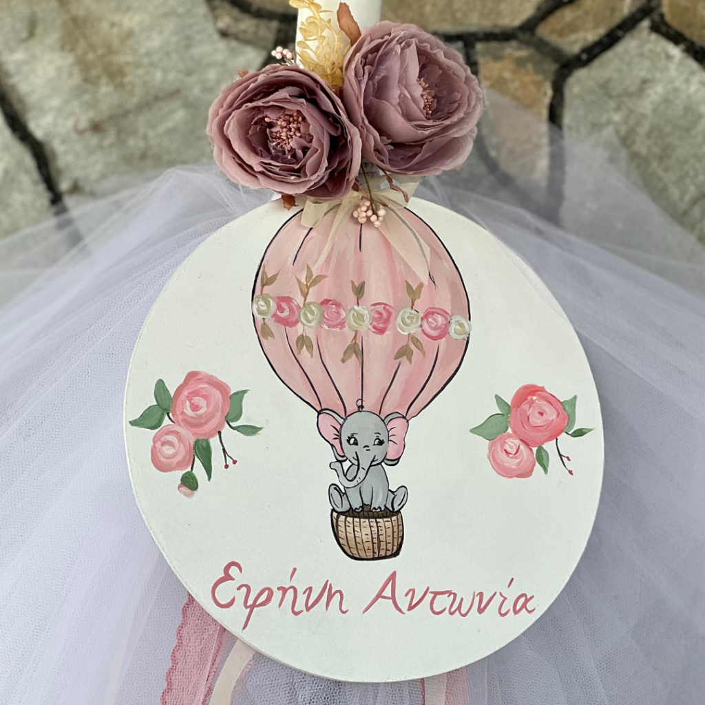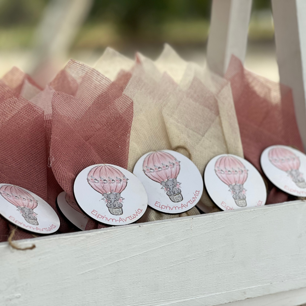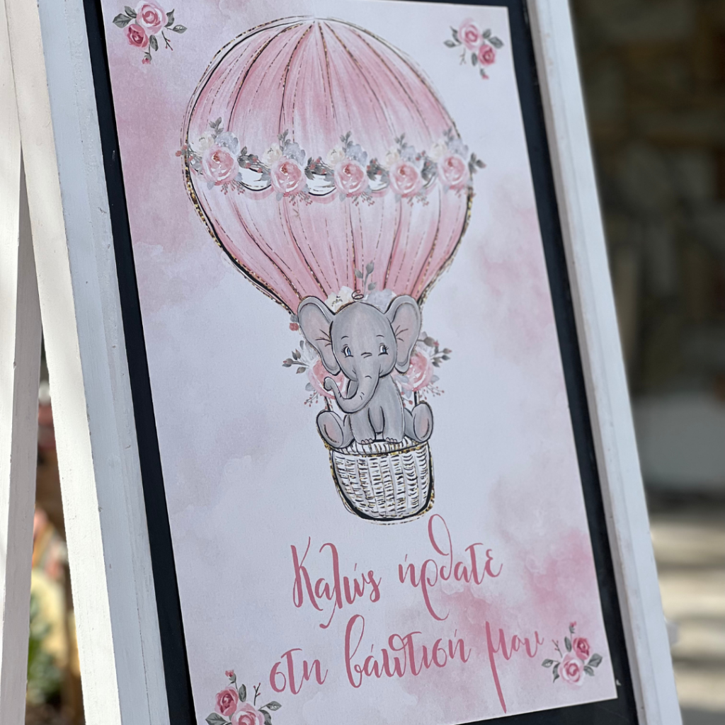 Εντυπωσιακά πάνελ, μπαλονοσυνθέσεις, αέρινα υφάσματα στις αποχρώσεις του σάπιου μήλου και του ροζ, ψάθινα καλάθια και βάζα με λουλούδια, συνέθεσαν ένα μοναδικό σκηνικό που ξεχείλιζε από ρομαντισμό και ομορφιά! Το φωτογραφικό υλικό , θα σας μεταφέρει σε αυτό το μοναδικό στολισμό, με θέμα το ελεφαντάκι και το αερόστατο!
