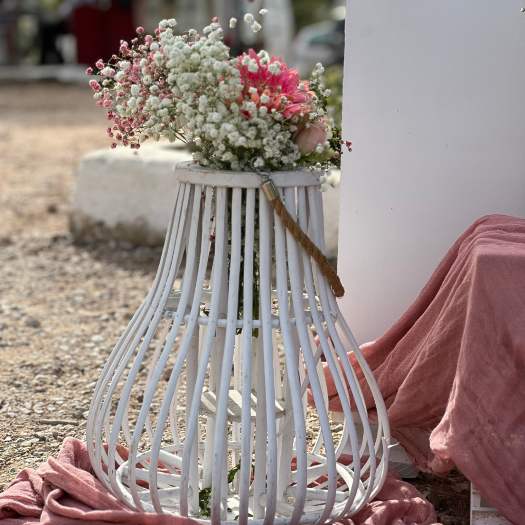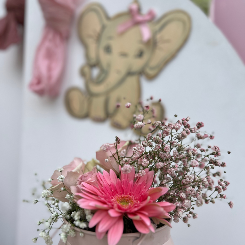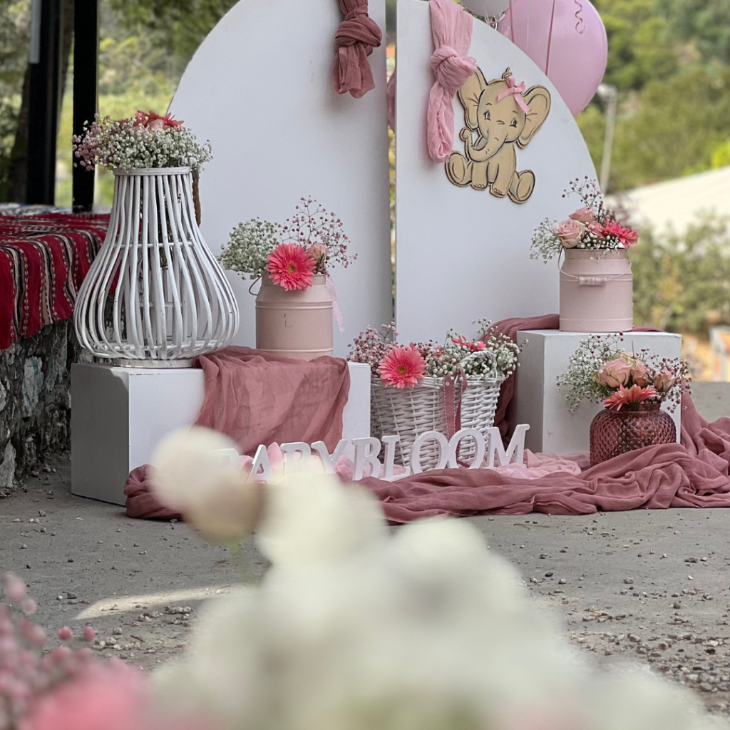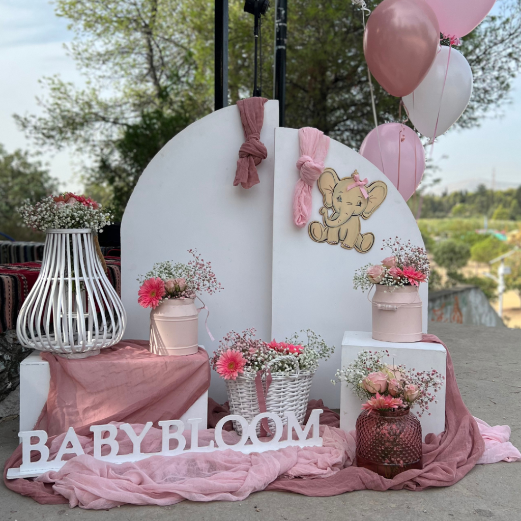 Εντυπωσιακά πάνελ, μπαλονοσυνθέσεις, αέρινα υφάσματα στις αποχρώσεις του σάπιου μήλου και του ροζ, ψάθινα καλάθια και βάζα με λουλούδια, συνέθεσαν ένα μοναδικό σκηνικό που ξεχείλιζε από ρομαντισμό και ομορφιά! Το φωτογραφικό υλικό , θα σας μεταφέρει σε αυτό το μοναδικό στολισμό, με θέμα το ελεφαντάκι και το αερόστατο!