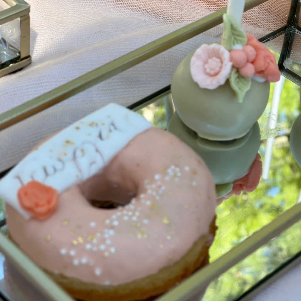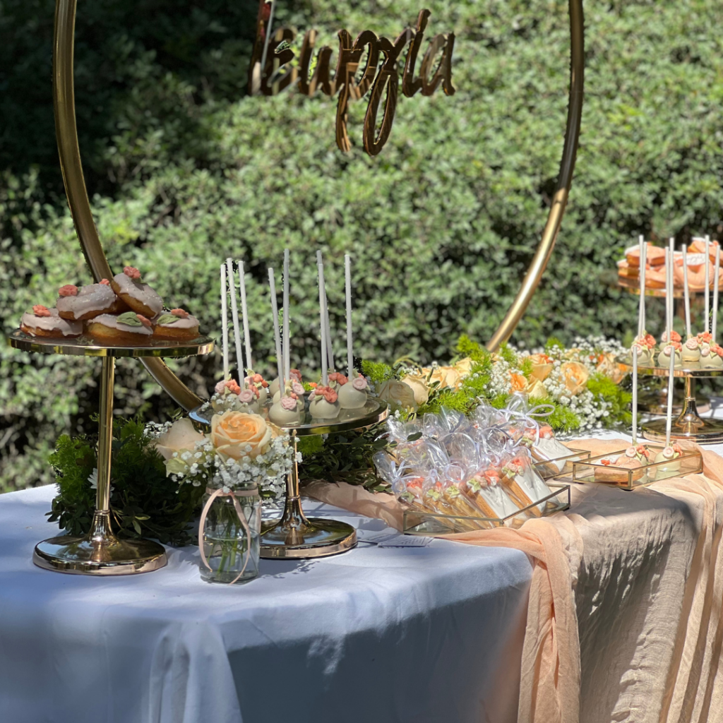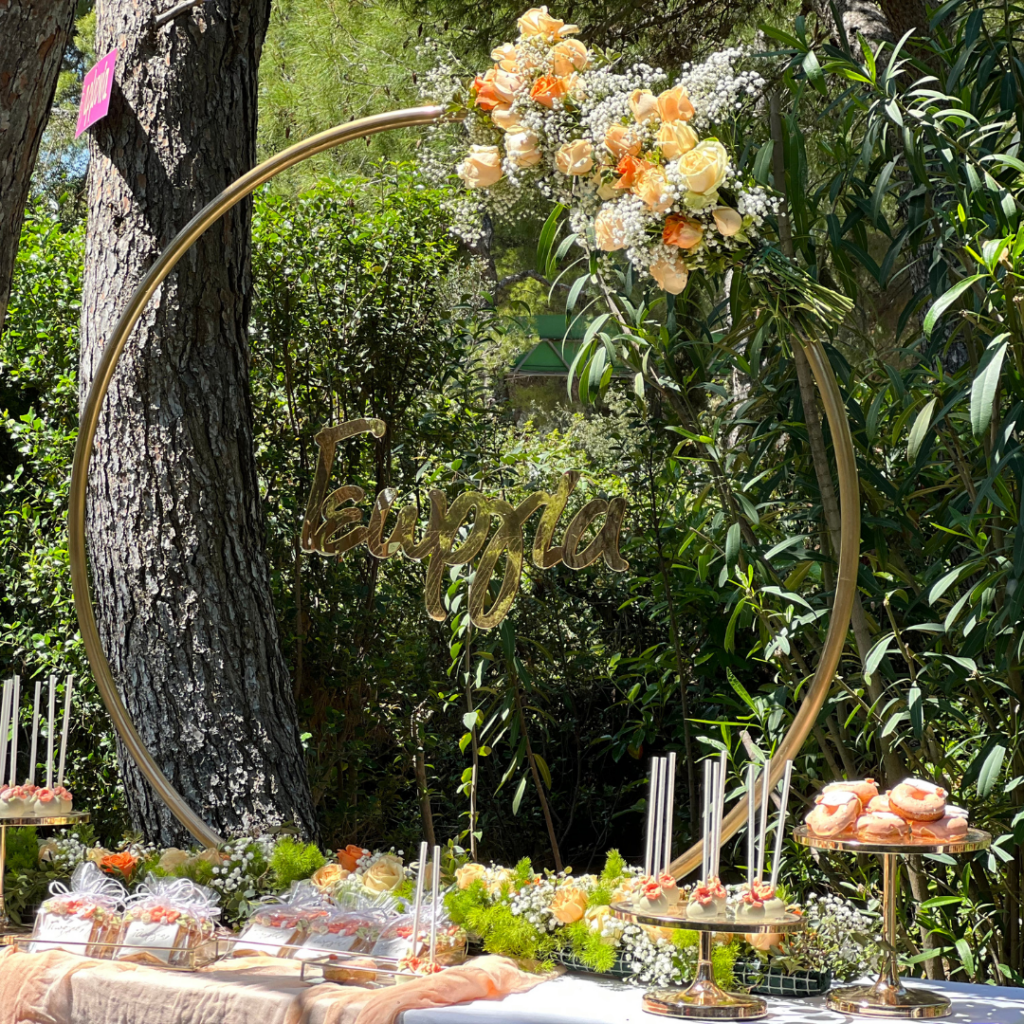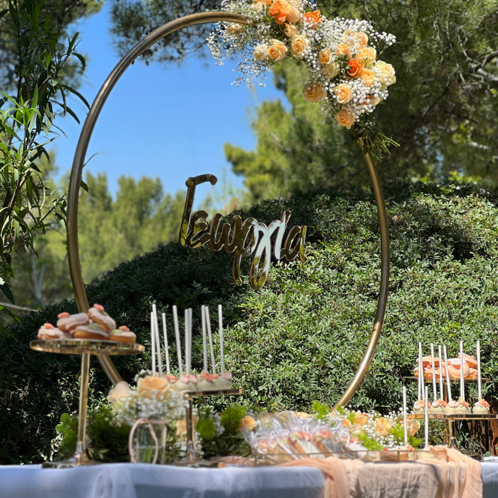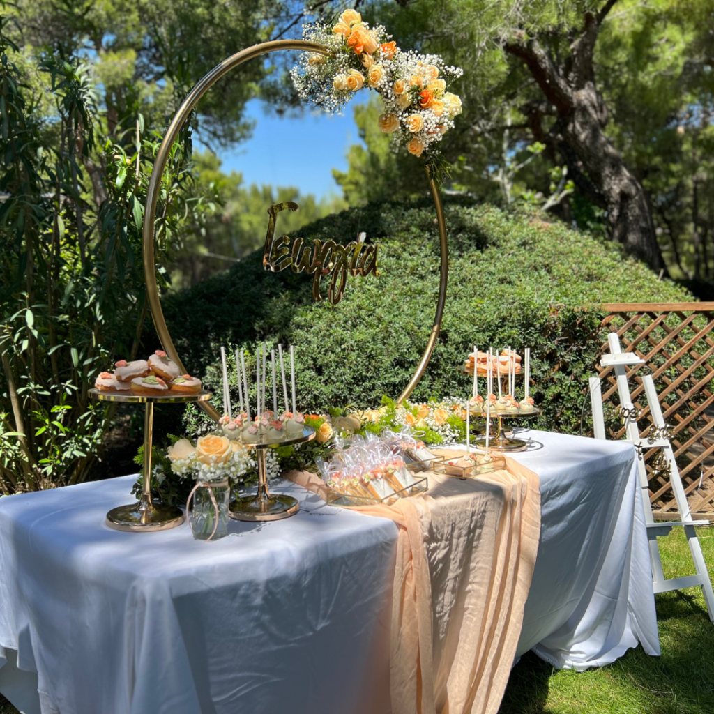Ντόνατς, μπισκότα και cakepops, φτιαγμένα με ακρίβεια στη λεπτομέρεια, σε αποχρώσεις του σωμόν, του πράσινου και του λευκού, και θεματικά συνδυασμένα με το στολισμό της βάπτισης, άφησαν το δικό τους μοναδικό αποτύπωμα πάνω στο candy bar, αλλά και τη διακόσμηση της βάπτισης! Οι μοναδικές δημιουργίες του pastry chef μας, τα αέρινα υφάσματα σε απαλές αποχρώσεις, και ο χρυσός κρίκος, αυτό το σύμβολο ολότητας, ενότητας, απείρου, συνέθεσαν ένα εντυπωσιακό candy bar βάπτισης, που υποδέχθηκε τους καλεσμένους της δεξίωσης και ανέδειξε με τον ομορφότερο τρόπο την προσωπικότητα της μικρής Γεωργίας!