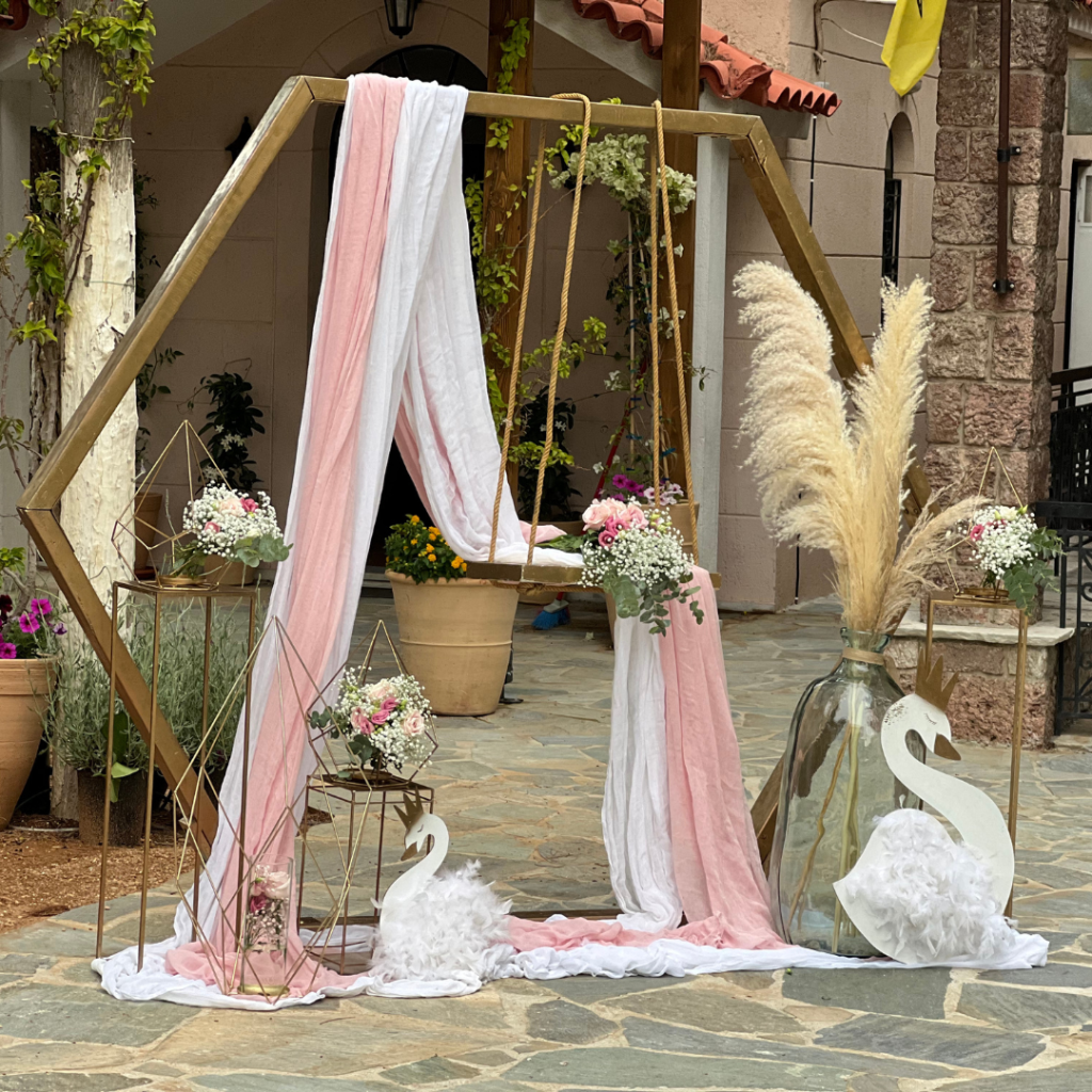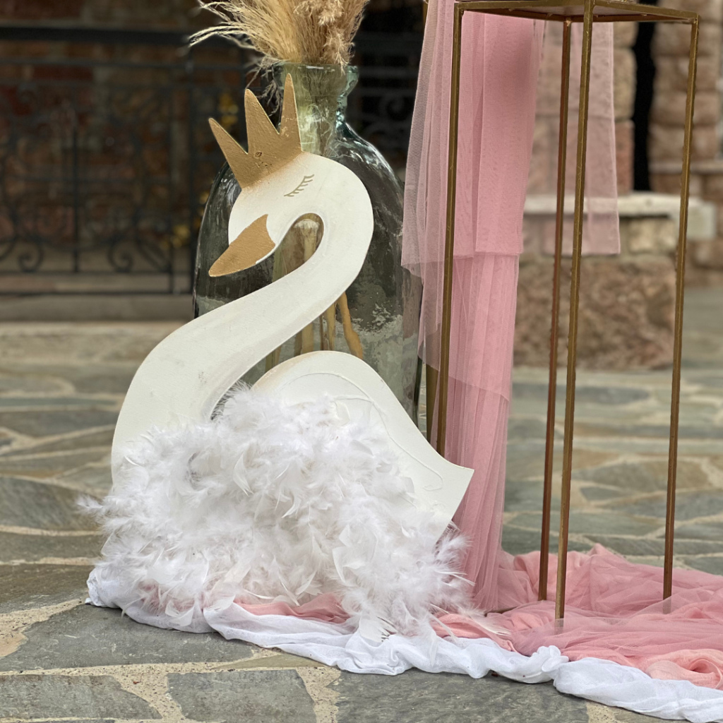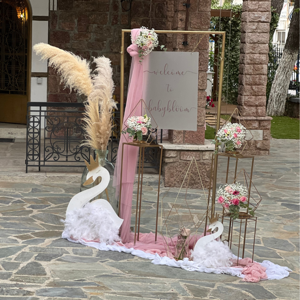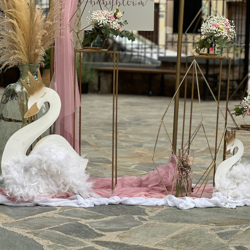 Πηγή χάρης και ομορφιάς, ο κύκνος αποτελεί ένα ιδιαίτερο θέμα βάπτισης που ξεχωρίζει για την κομψότητα και τη μοναδικότητά του! Αέρινα υφάσματα σε τόνους του ροζ και του λευκού, χρυσά γεωμετρικά σχήματα, φρέσκα λουλούδια, pampas grass και αριστοκρατικοί κύκνοι, δημιούργησαν μία παραμυθένια ατμόσφαιρα στον προαύλιο χώρο του Ιερού Ναού της Αγίας Παρασκευής Ιλίου!