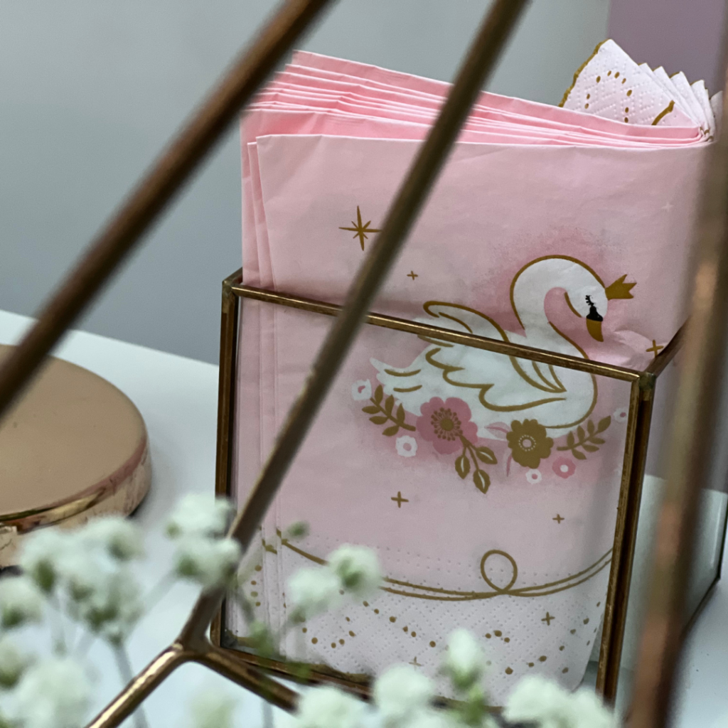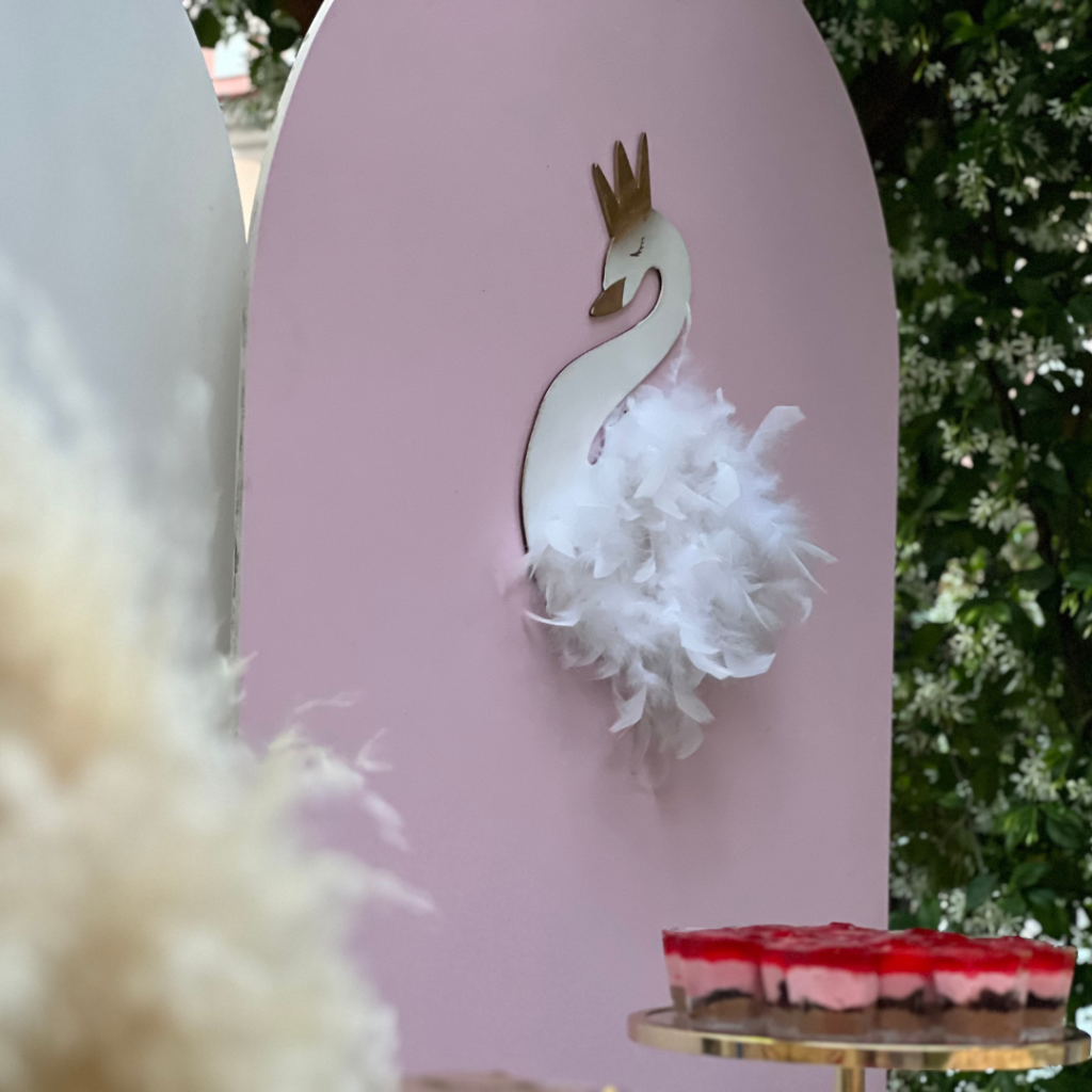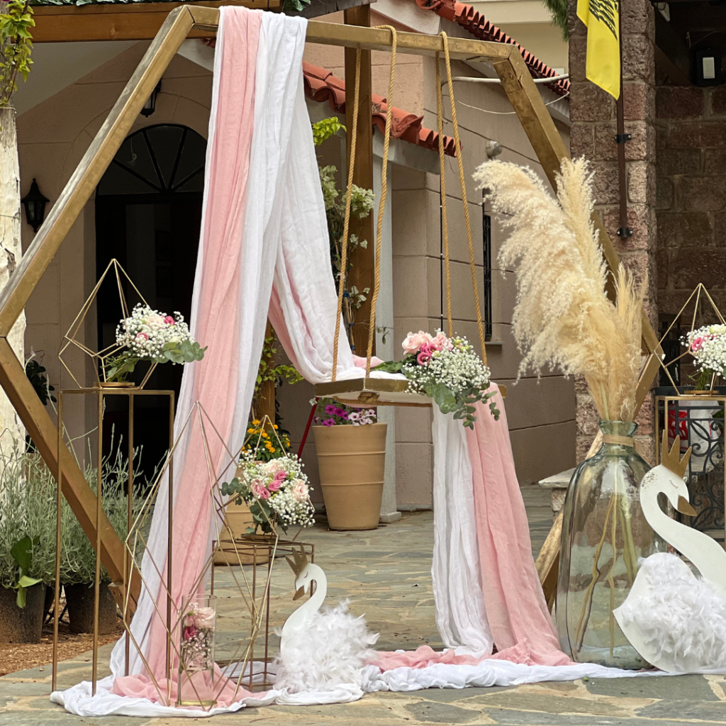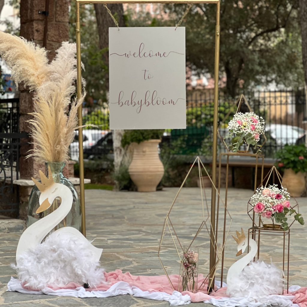 Πηγή χάρης και ομορφιάς, ο κύκνος αποτελεί ένα ιδιαίτερο θέμα βάπτισης που ξεχωρίζει για την κομψότητα και τη μοναδικότητά του! Αέρινα υφάσματα σε τόνους του ροζ και του λευκού, χρυσά γεωμετρικά σχήματα, φρέσκα λουλούδια, pampas grass και αριστοκρατικοί κύκνοι, δημιούργησαν μία παραμυθένια ατμόσφαιρα στον προαύλιο χώρο του Ιερού Ναού της Αγίας Παρασκευής Ιλίου!