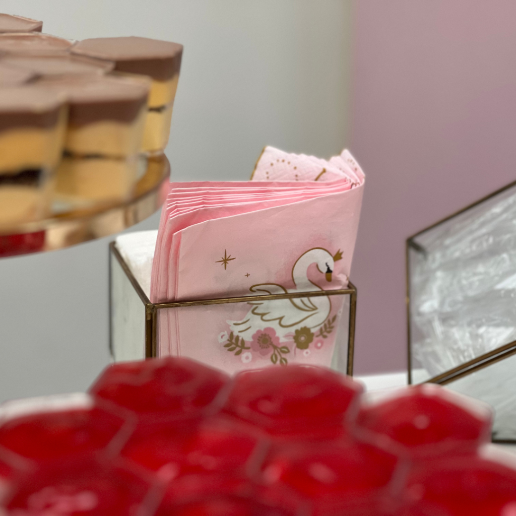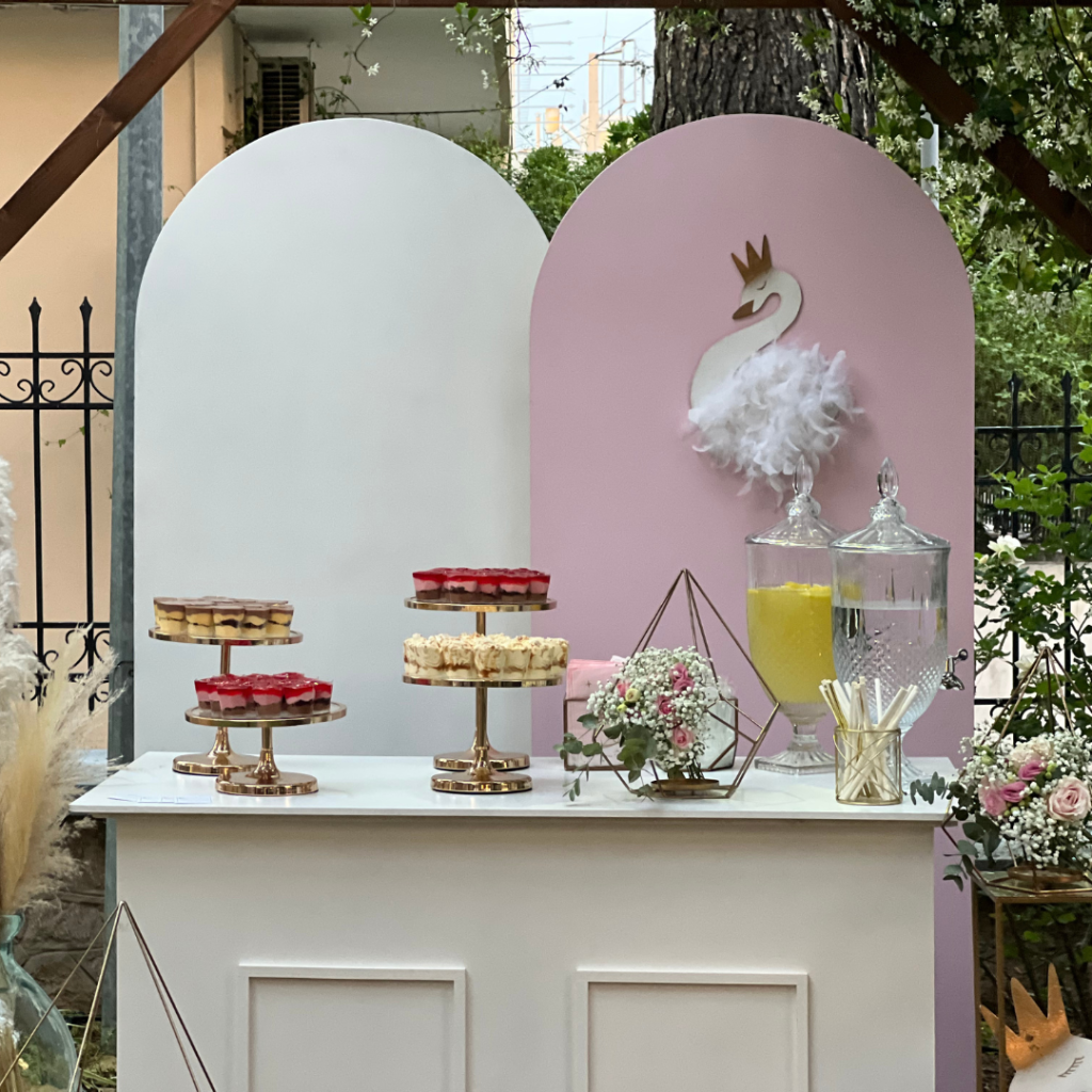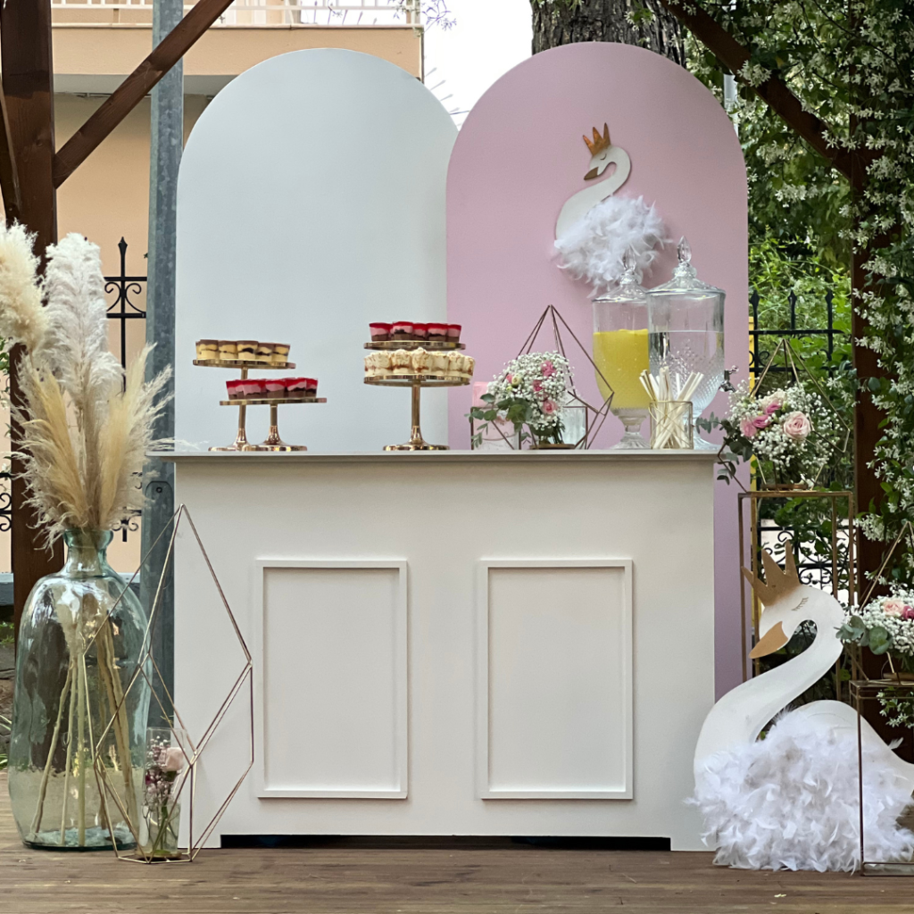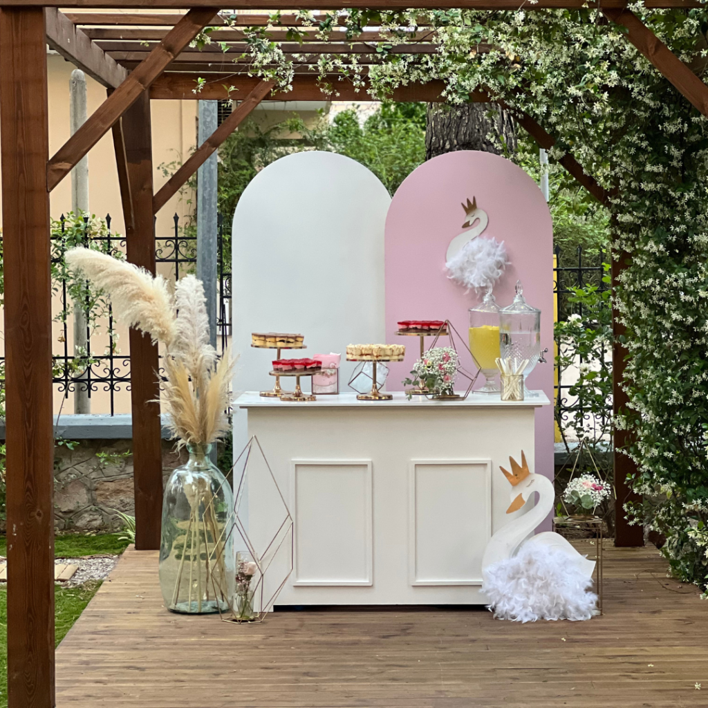 Και αν αναρωτιέστε πως συνδυάζονται οι γλυκές δημιουργίες με την χάρη των κύκνων, τότε το candy bar που σας παρουσιάζουμε , θα σας δώσει την απάντηση που ψάχνετε! Πανδαισία γλυκών γεύσεων και δροσιστικά, πλαισιωμένα με λευκό και ροζ πάνελ , πριγκιπικό κύκνο και pampas, κέρδισαν τις εντυπώσεις όλων των καλεσμένων!