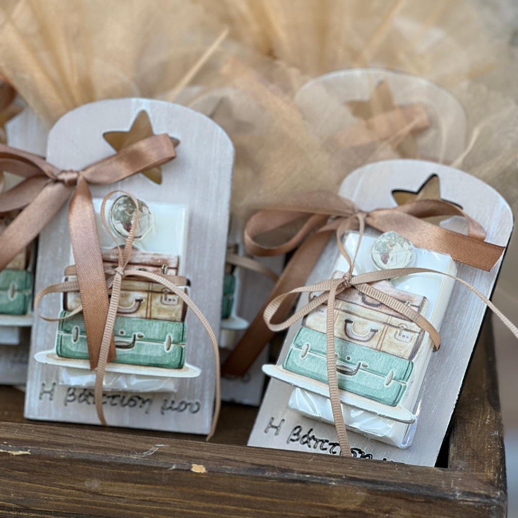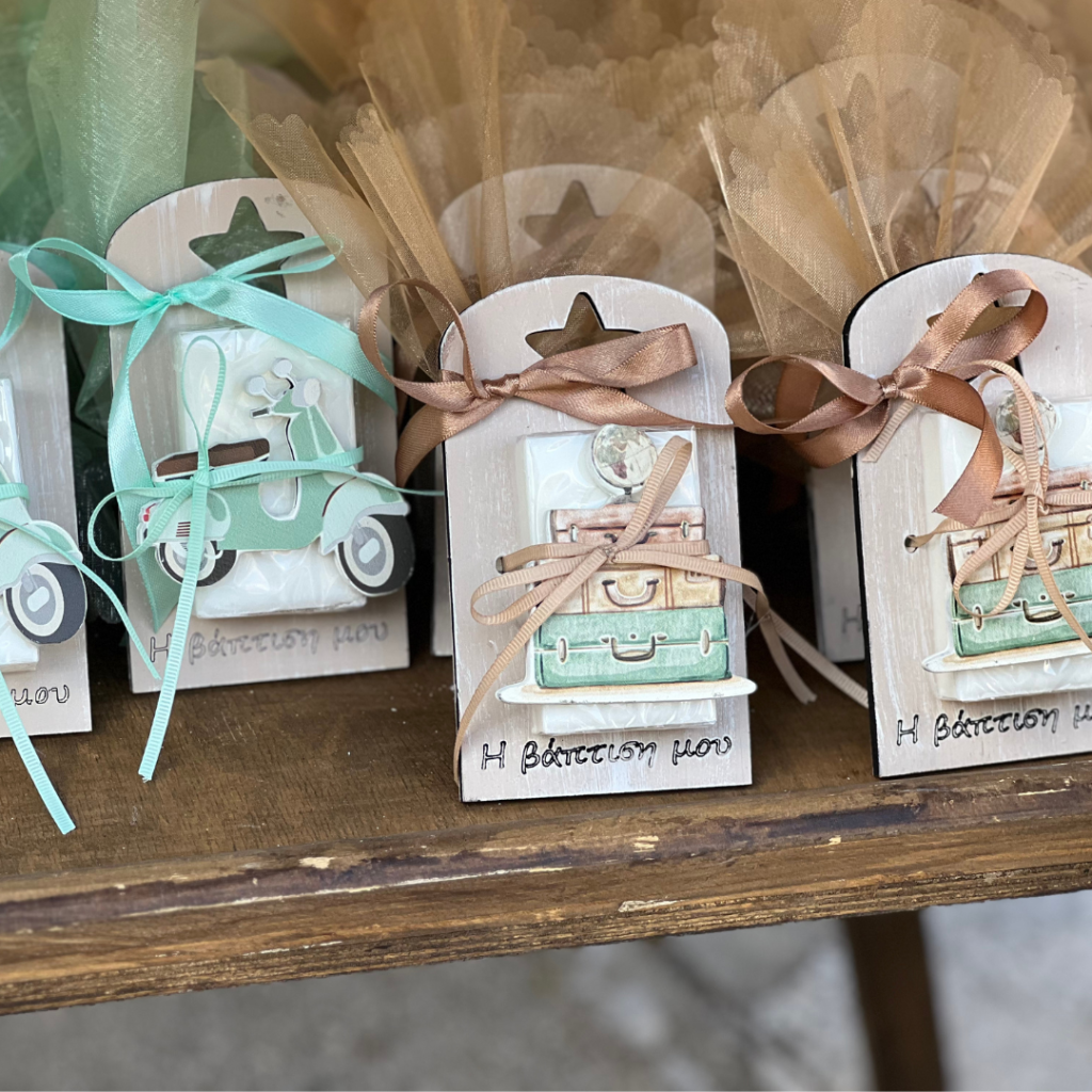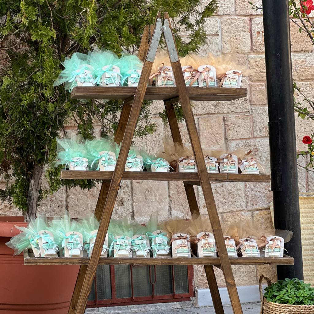 Τα ξύλινα σταντ με τις μπομπονιέρες, χρωματικά συνδυασμένες με το θέμα της βάπτισης, ευχαρίστησαν τους καλεσμένους της βάπτισης της του μικρού Φίλιππου με τον ομορφότερο τρόπο!