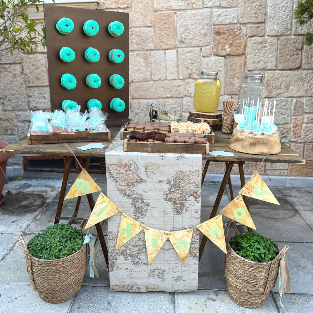 Διακοσμημένο με χάρτες, λουλούδια και σημαιάκια, το candy bar βάπτισης του μικρού Φίλιππου ήταν γεμάτο με θεματικά cake pops, μπισκότα, ντόνατς, ατομικά γλυκά αλλά και τα απαραίτητα δροσιστικά, κι έκλεψε τις εντυπώσεις όλων των καλεσμένων!