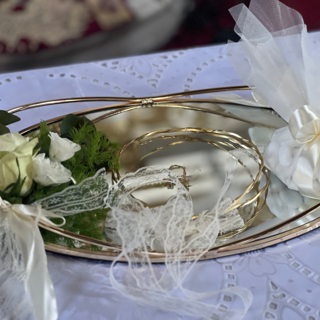 Η καράφα και το ποτήρι από κρύσταλλα Βοημίας και στέφανα από χρυσό και ασήμι, αποτελέσαν ένα όμορφο ενθύμιο από τον κουμπάρο για τους νεόνυμφους, Παναγιώτη και Κατερίνα!