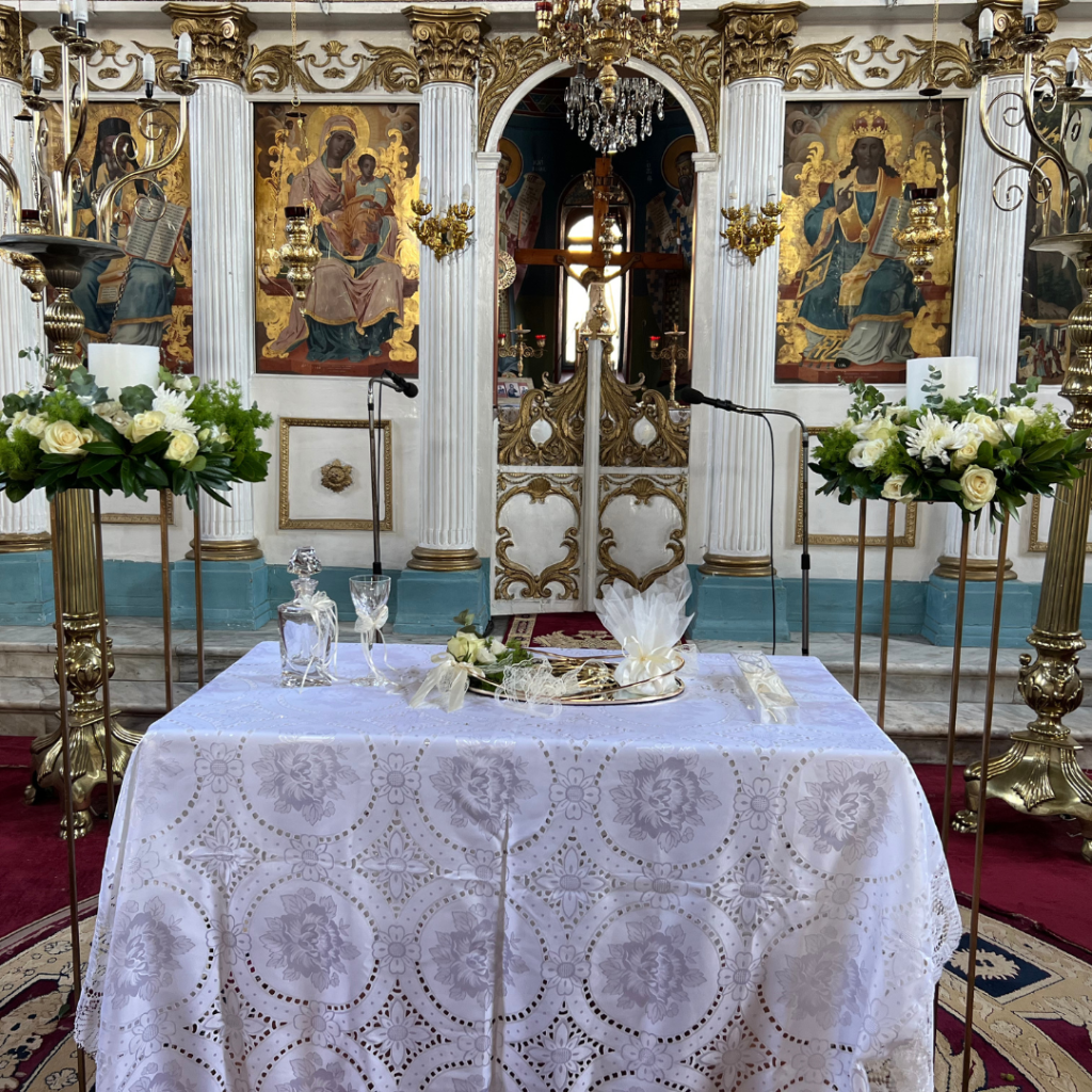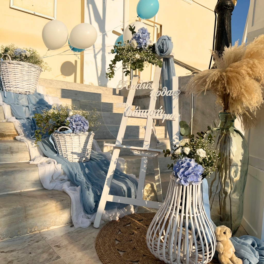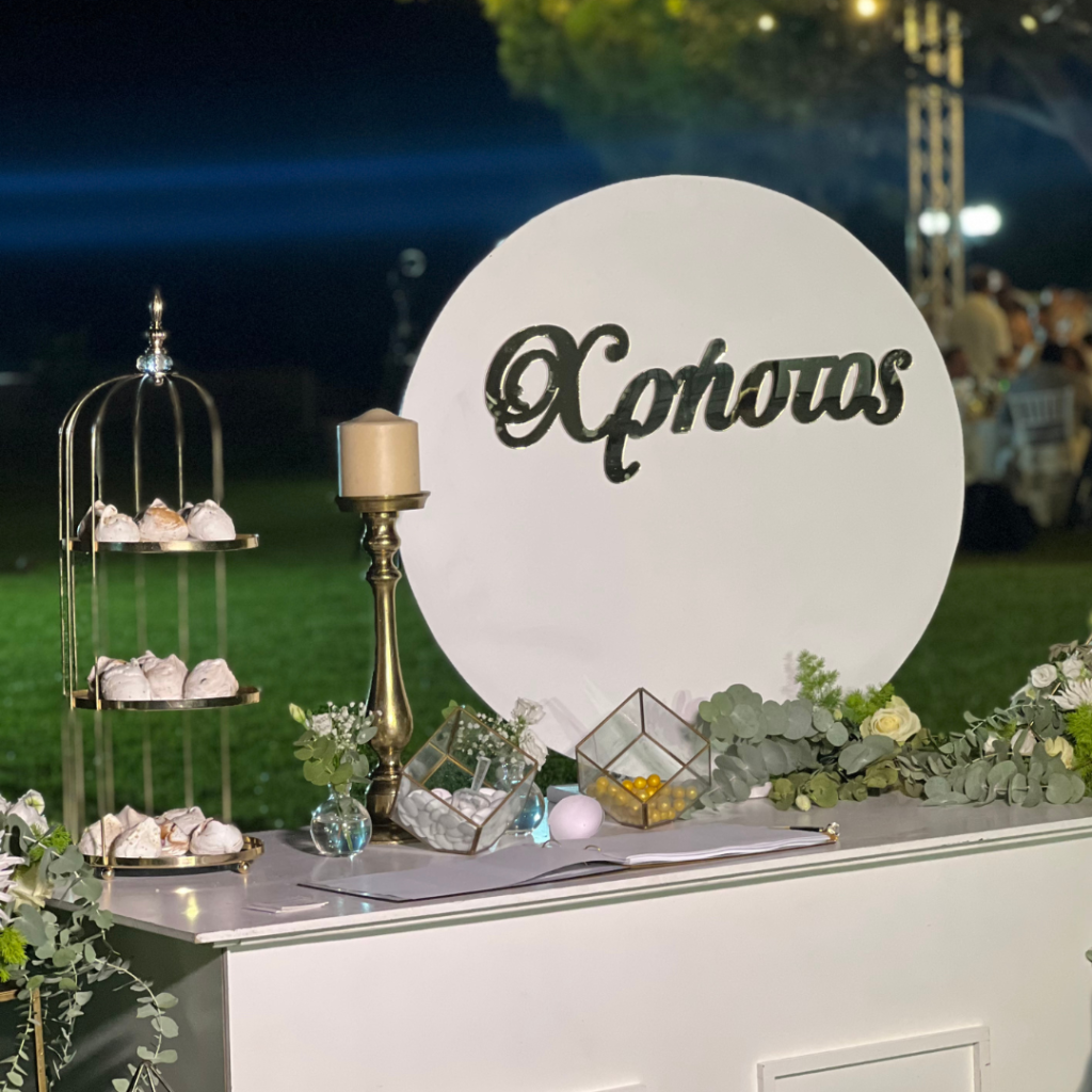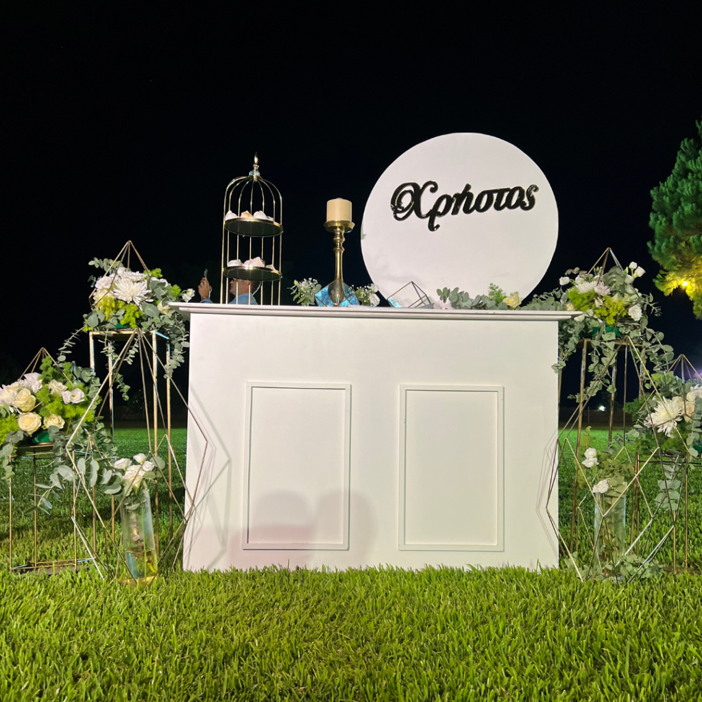 Χρυσό πολύγωνο με μπαλόνια, καλάθια με λουλούδια, και εντυπωσιακό τραπέζι ευχών με το όνομα του νεοφώτιστου, κυριάρχησαν στον προαύλιο χώρο του κτήματος Παναγόπουλου, δίνοντας έναν elegant χαρακτήρα στη δεξίωση!