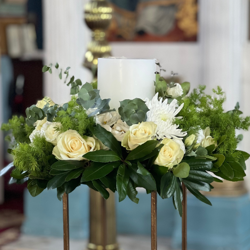 Οι λαμπάδες του γάμου, που αποτελούν ένα από τα σημαντικότερα και πιο κεντρικά σημεία του μυστηρίου, καθώς φαίνονται σε όλη τη διάρκειά του, διακοσμήθηκαν με φρέσκα άνθη, που απέπνεαν ζωντάνια, φρεσκάδα και προσέδωσαν κομψότητα στο στολισμό!