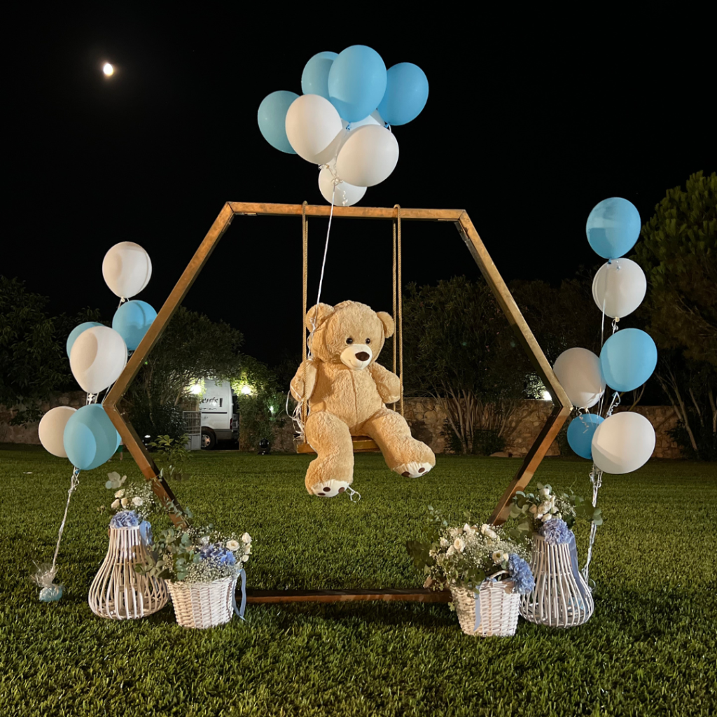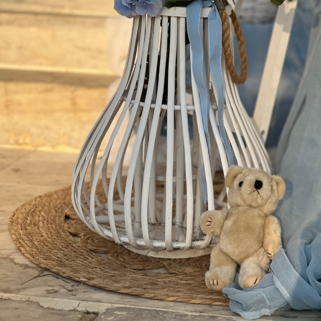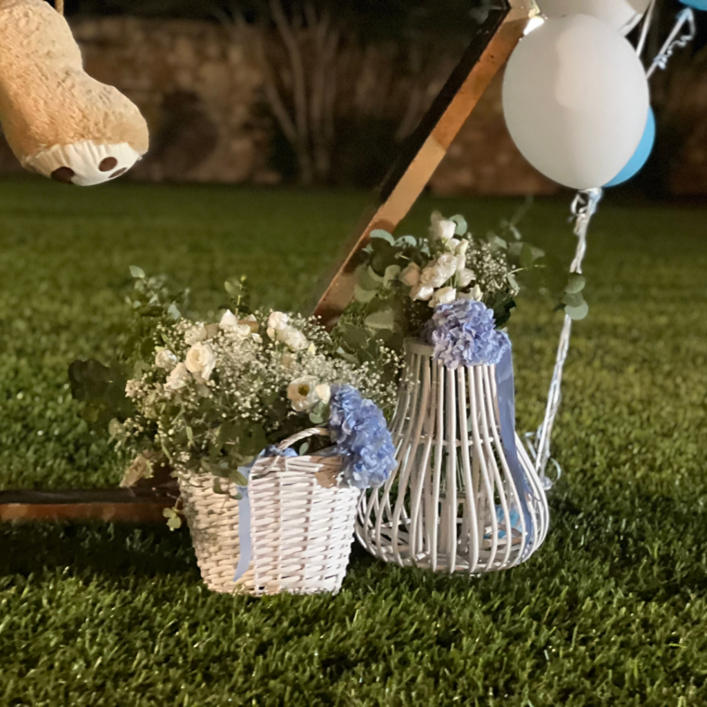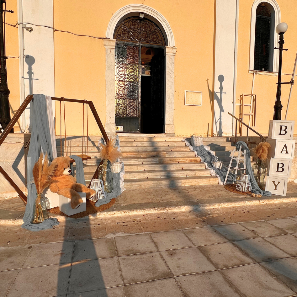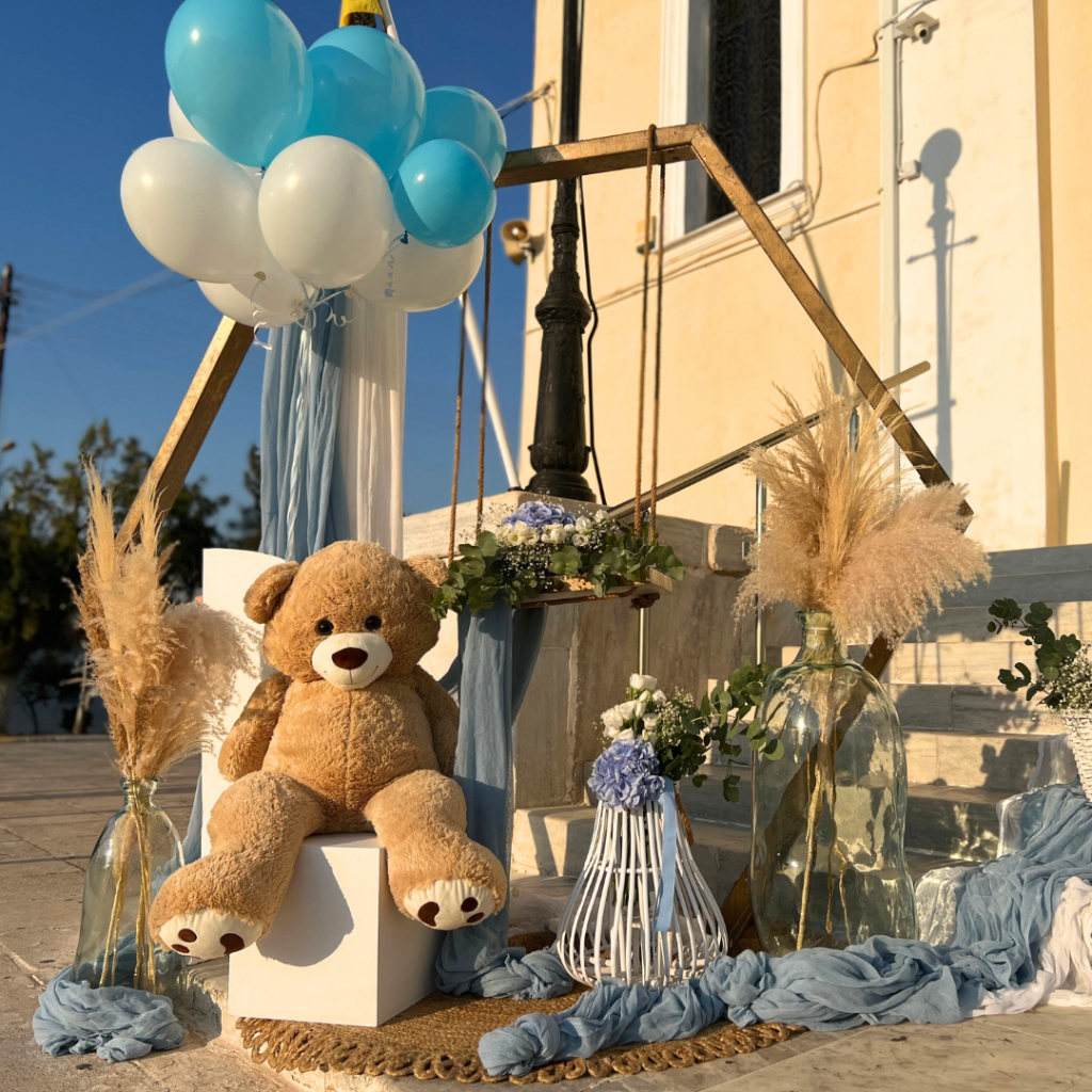 Στο στολισμό βάπτισης του μικρού Χρήστου, επιβλητικό χρυσό πολύγωνο, γυάλες με pampas grass, ψάθινα καλάθια, αρκουδάκι και μπαλόνια, συνέθεσαν μία διακόσμηση δημιουργική, παραμυθένια και παιχνιδιάρικη, που απογείωσε το σκηνικό και καθήλωσε τους καλεσμένους της βάπτισης!