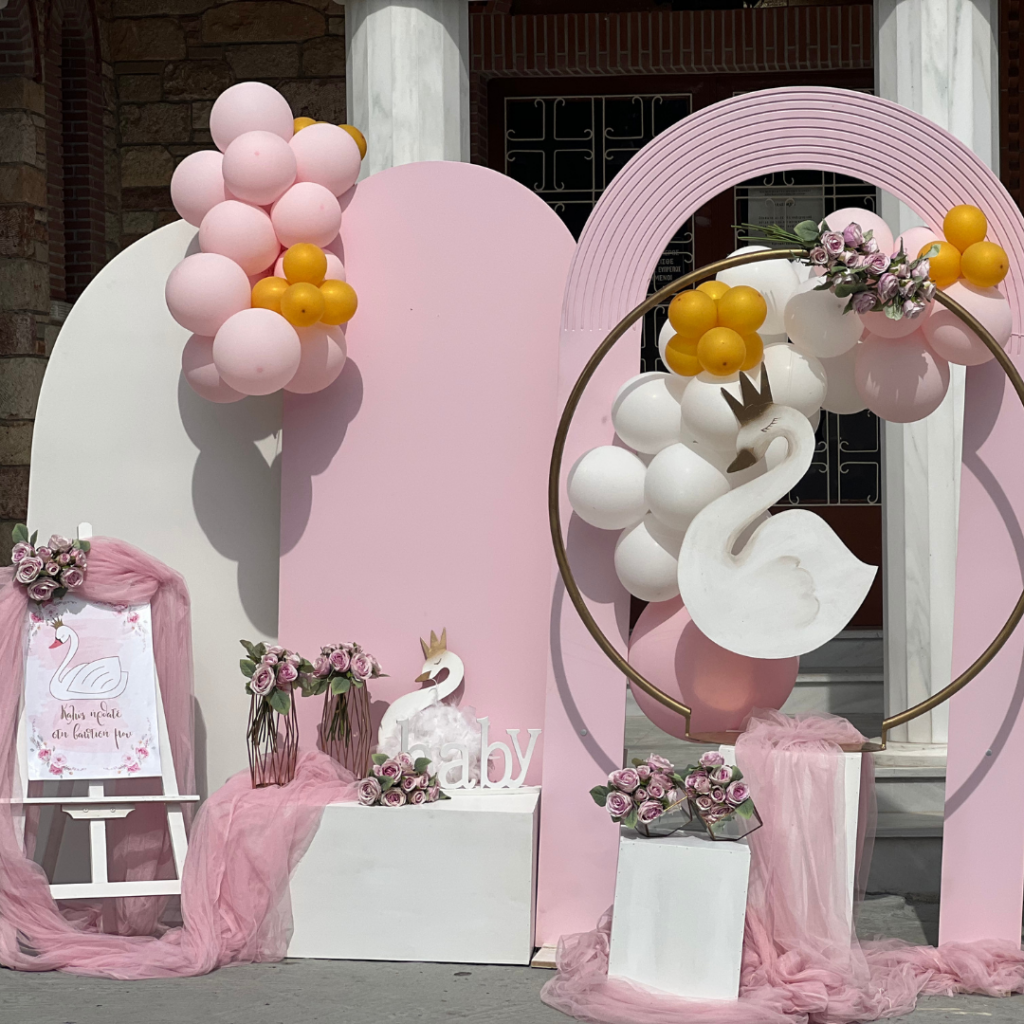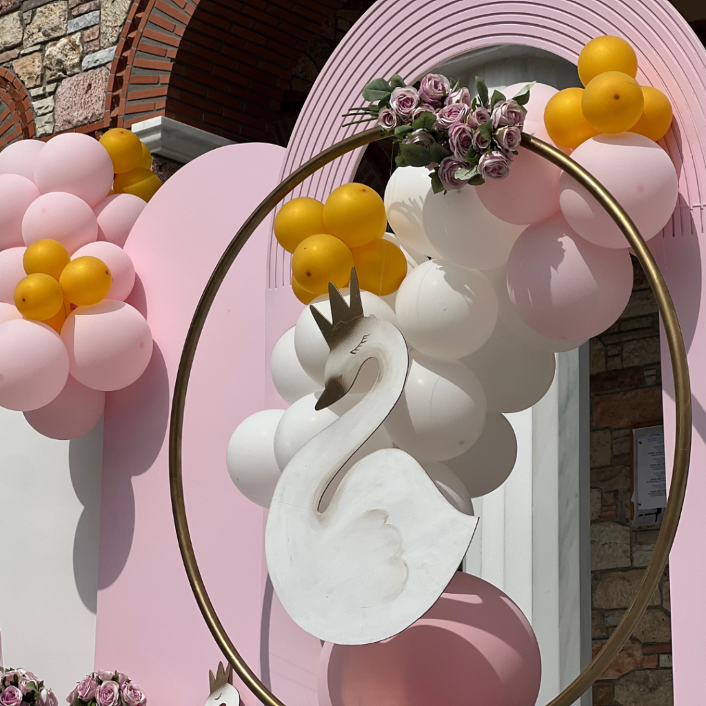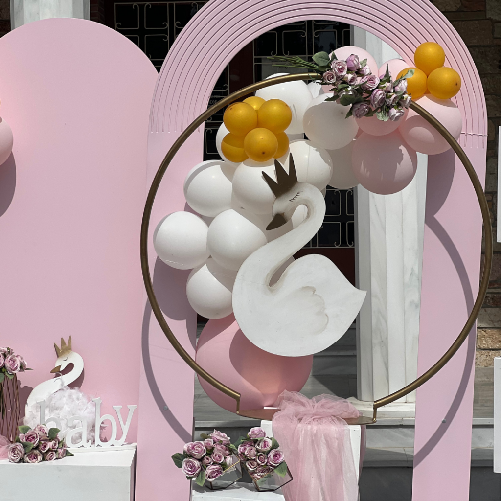Ένας από τα ομορφότερα θέματα για στολισμό βάπτισης, που ήρθε για να μείνει και υπόσχεται ένα φαντασμαγορικό αποτέλεσμα, είναι ο κύκνος. Η διακόσμηση με τα αέρινα υφάσματα, σε τόνους του ροζ, ο εντυπωσιακός χρυσός κρίκος με τον επιβλητικό κύκνο και τα πάνελ με τα μπαλόνια, έδωσαν πριγκιπικό χαρακτήρα στη βάπτιση της μικρής Λυδίας και δημιούργησαν μία μοναδική ατμόσφαιρα, που ξεχείλιζε από ζωντάνια και ανεμελιά!