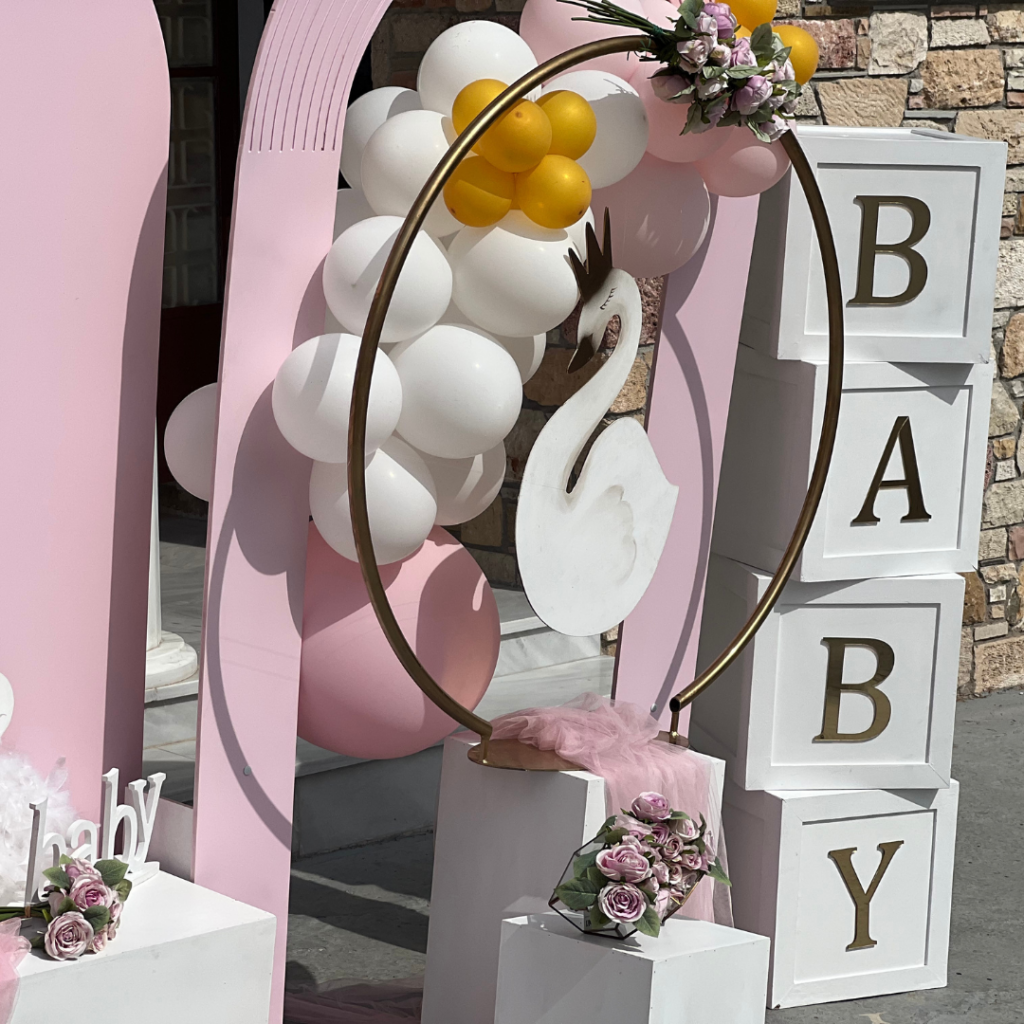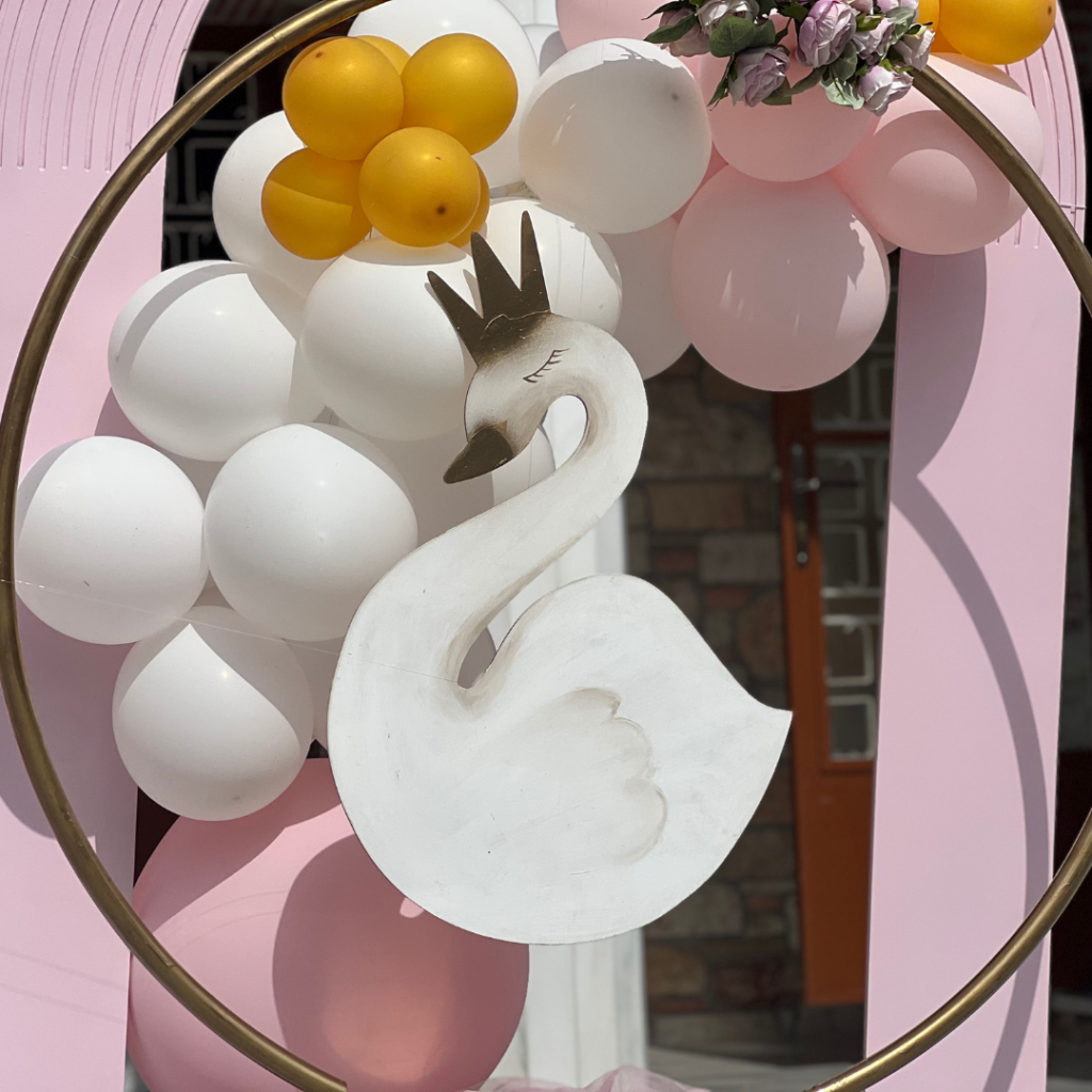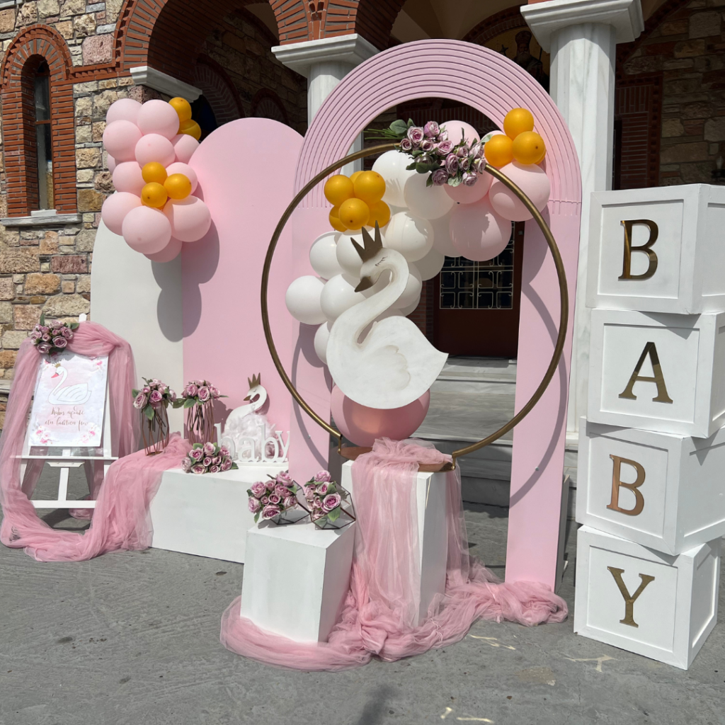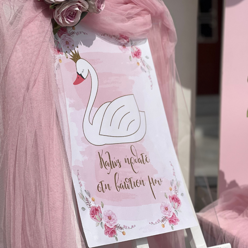 Ένας από τα ομορφότερα θέματα για στολισμό βάπτισης, που ήρθε για να μείνει και υπόσχεται ένα φαντασμαγορικό αποτέλεσμα, είναι ο κύκνος. Η διακόσμηση με τα αέρινα υφάσματα, σε τόνους του ροζ, ο εντυπωσιακός χρυσός κρίκος με τον επιβλητικό κύκνο και τα πάνελ με τα μπαλόνια, έδωσαν πριγκιπικό χαρακτήρα στη βάπτιση της μικρής Λυδίας και δημιούργησαν μία μοναδική ατμόσφαιρα, που ξεχείλιζε από ζωντάνια και ανεμελιά!