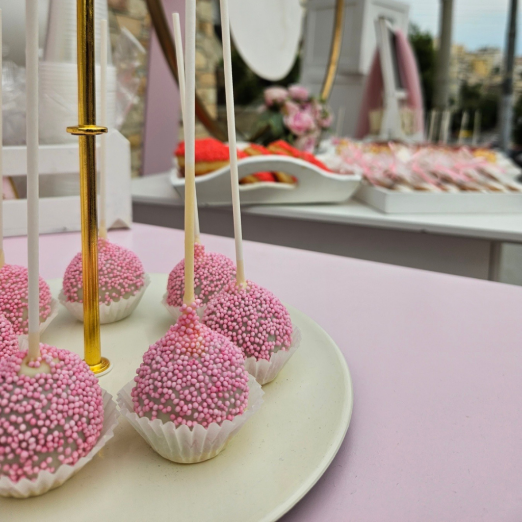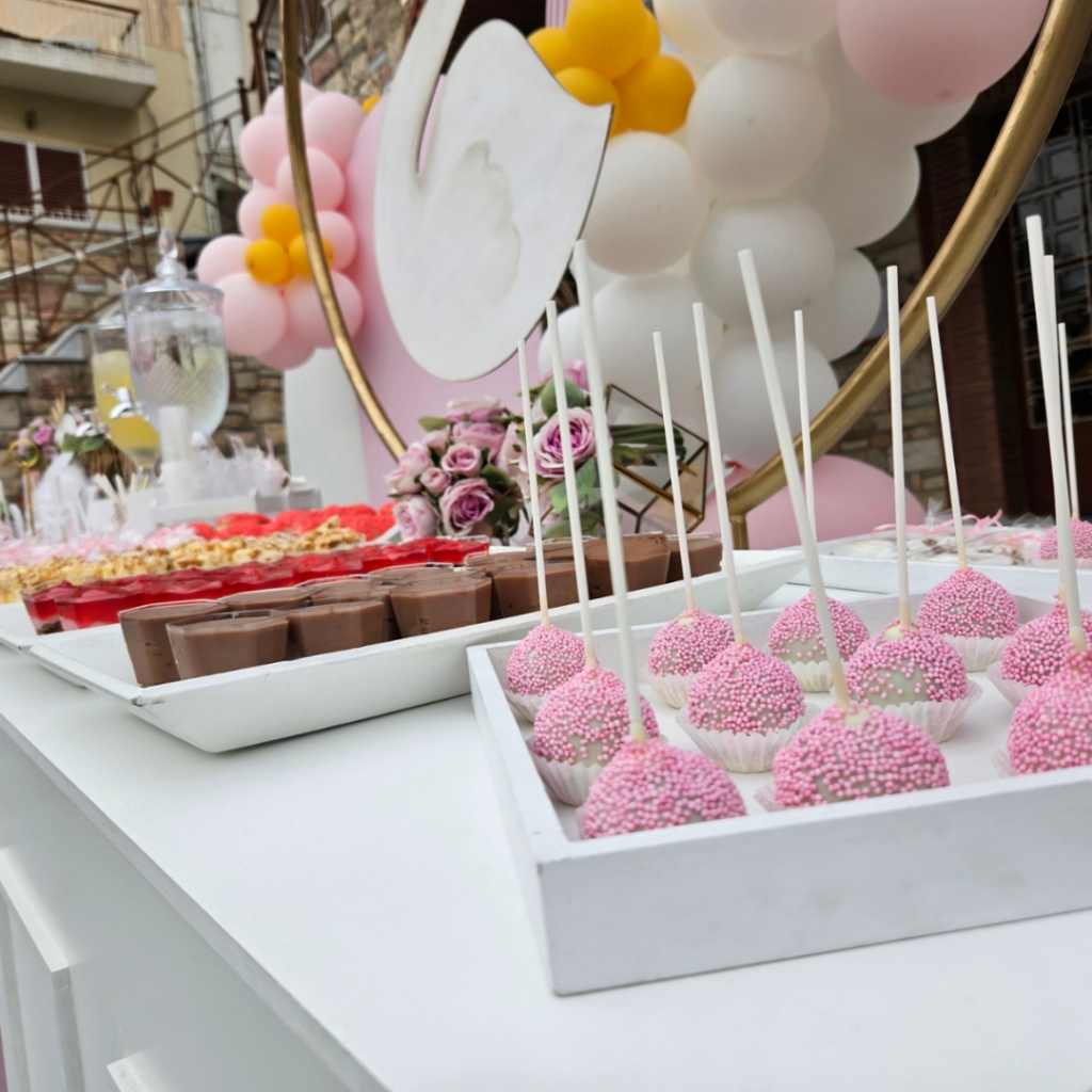 Μπισκότα, cake pops και ατομικά γλυκά σε διαφορετικές γεύσεις, σε συνδυασμό με τα μπαλόνια, τον χρυσό κρίκο με τον πριγκιπικό κύκνο και τα πάνελ, συνέθεσαν ένα μοναδικό candy bar βάπτισης, που έκλεψε τις εντυπώσεις όλων των καλεσμένων στη βάπτιση της μικρής Λυδίας!