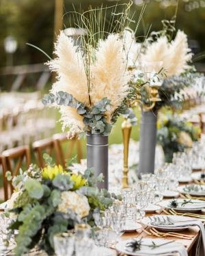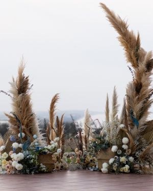 Οι ανθοσυνθέσεις boho τύπου απομακρύνονται από τη συμμετρική, τυποποιημένη παράδοση και υιοθετούν μια λογική «ελεγχόμενης αταξίας», όπου η κίνηση και η φυσικότητα υπερισχύουν της αυστηρής γεωμετρίας. Αγριολούλουδα, ευκάλυπτος, pampas grass, στάχυα και εποχικά φυτά συνδυάζονται με περιορισμένη παρουσία πιο κλασικών λουλουδιών, δημιουργώντας ένα αποτέλεσμα που παραπέμπει σε «συλλογή από τον αγρό». Η χρήση αποξηραμένων λουλουδιών και χόρτων δεν έχει μόνο πρακτική διάσταση (αντοχή, επανάχρηση) αλλά και συμβολική, καθώς υποδηλώνει μια αισθητική διαχρονικότητας και μνήμης: η στιγμή του γάμου παραμένει και πέρα από την ημέρα της τελετής. Η φύση έτσι δεν αποτελεί απλό φόντο, αλλά ενεργό σημαίνον της τελετής.