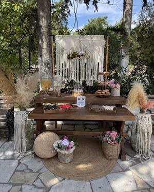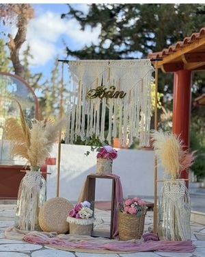 Κεντρικό ρόλο στον σχεδιασμό παίζουν τα φυσικά υλικά – μακραμέ, ψάθινα καλάθια, σχοινένιες υφές και γυάλες – τα οποία αποτελούν βασικούς φορείς της boho αισθητικής σε βάπτιση και γάμο. Το μακραμέ backdrop πίσω από το candy table λειτουργεί ως εικαστικό φόντο υψηλής υφής, προσφέροντας βάθος στο σκηνικό και δημιουργώντας ιδανική επιφάνεια για φωτογράφιση των γλυκών, των καλεσμένων και της οικογένειας.