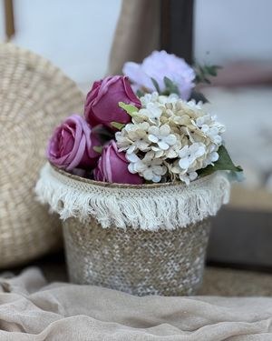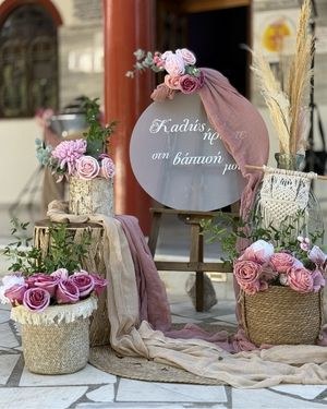 Οι συνθέσεις με τριαντάφυλλα σε αποχρώσεις dusty pink, ροζ παλ και ιβουάρ, σε συνδυασμό με pampas grass και ευκάλυπτο, επεκτείνουν τη boho λογική στον κάθετο άξονα του χώρου, δημιουργώντας ρυθμικές εναλλαγές ύψους. Οι μπομπονιέρες, δεμένες με δίχρωμες γάζες σε ροζ και εκρού και απλό σπάγκο, αποτελούν μικρογραφία της βασικής αισθητικής, ενώ η διακόσμηση της κολυμπήθρας με τις ίδιες γάζες και λουλούδια διασφαλίζει ότι το τελετουργικό κέντρο του μυστηρίου εντάσσεται οργανικά στο γενικό concept.