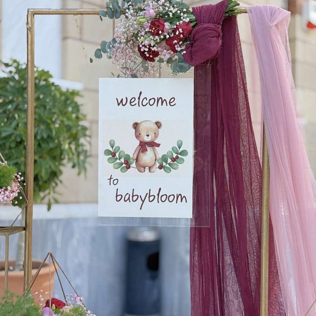 Ο στολισμός βάπτισης με το αρκουδάκι κυριάρχησε σε όλο τον χώρο, χαρίζοντας ιδιαίτερη ζεστασιά και θεατρικότητα. Οι αποχρώσεις του μπορντό, του ροζ, του χρυσού και του πράσινου συνδυάστηκαν μοναδικά στα διακοσμητικά στοιχεία, δημιουργώντας ένα σκηνικό εμπνευσμένο από το winter wonderland. Υφάσματα σε burgundy και dusty pink αγκάλιαζαν τα μεταλλικά γεωμετρικά stands και πλαισίωναν κάθε σύνθεση, προσθέτοντας επιπλέον ρομαντισμό και διακριτική πολυτέλεια.