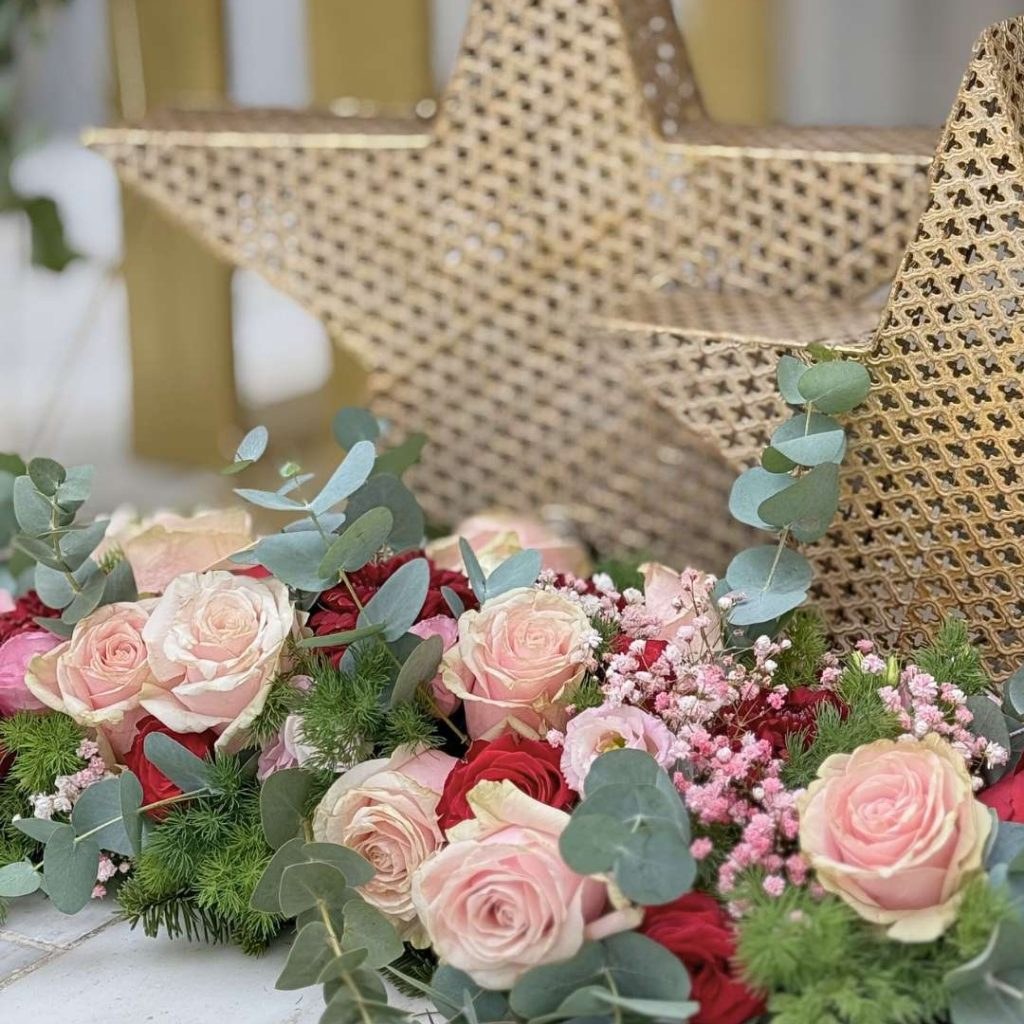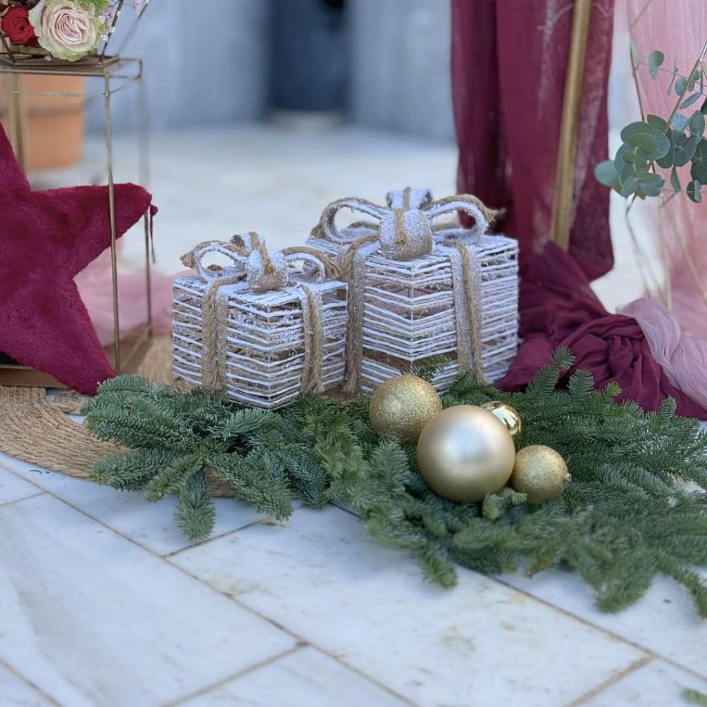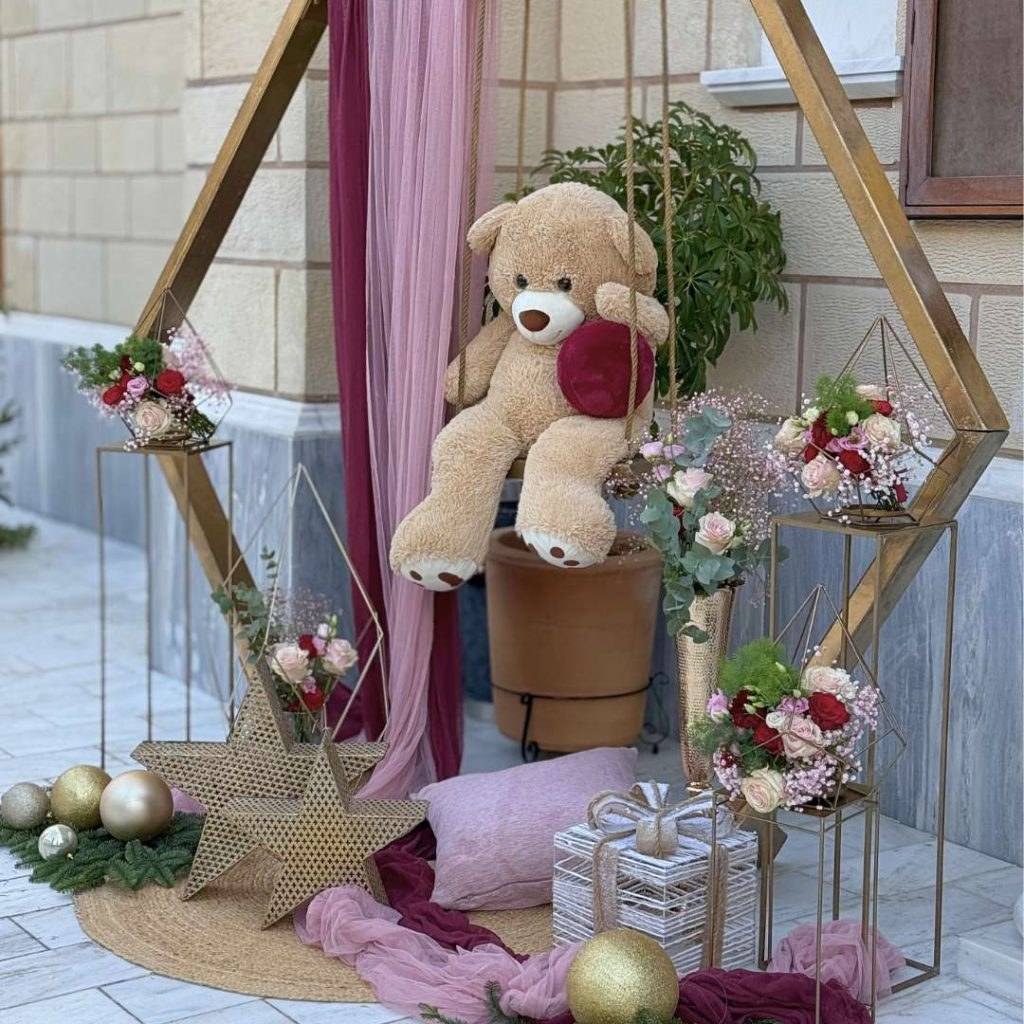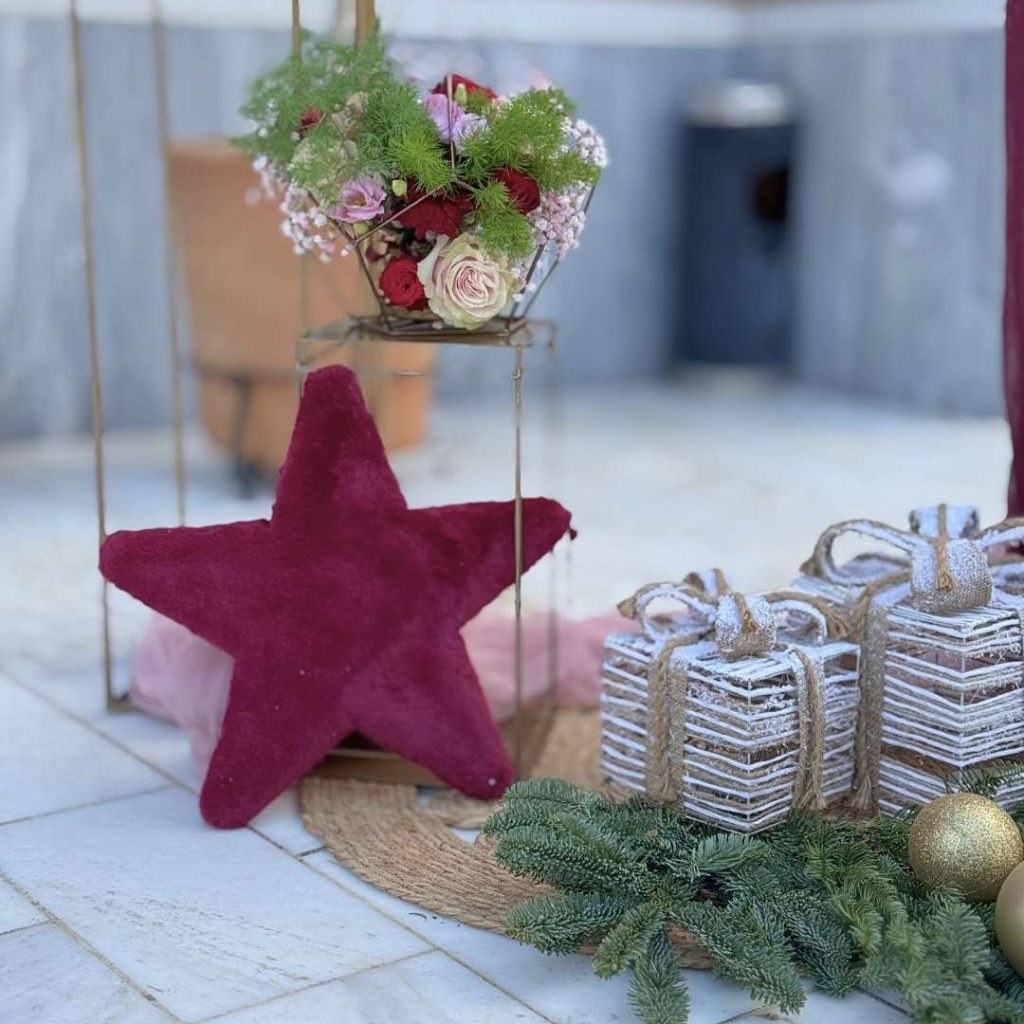 Ο στολισμός του εξωτερικού χώρου ξεκίνησε με welcome stand, που συνδύαζε διακοσμητικά φυτά, λουλούδια, μια γλυκύτατη πινακίδα με teddy bear και festive πινελιές. Μπουκέτα από γυψοφίλη, τριαντάφυλλα, γαρύφαλλα και πλούσιες πρασινάδες στόλιζαν τα γεωμετρικά βάζα, ενώ στο κάτω μέρος μεγάλα αστέρια, βελούδινες στέκες, κουτιά-δώρο, έλατα, χριστουγεννιάτικες μπάλες και γιρλάντες ολοκλήρωναν το παραμυθένιο εορταστικό setting. Η παρουσία της λαμπερής μπορντό και ροζ παλέτας έδινε στο χώρο έναν συνδυασμό παιδικής ανεμελιάς και γιορτινής λάμψης.