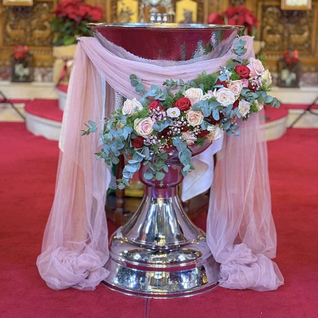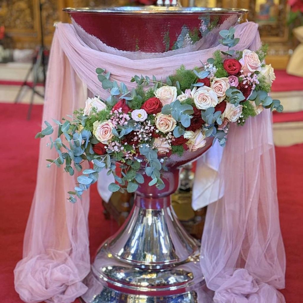 Η κολυμπήθρα στην εκκλησία διακοσμήθηκε με αέρινο dusty pink ύφασμα, πλούσιες συνθέσεις με τριαντάφυλλα, baby’s breath και ευκάλυπτο, κάνοντας τον χώρο πραγματικά ξεχωριστό και γιορτινό. Η elegant floral διακόσμηση συνδυάστηκε υπέροχα με το ξύλινο τέμπλο και το βαθύ κόκκινο χαλί, ολοκληρώνοντας ένα οπτικό αποτέλεσμα που έδινε μεγαλοπρέπεια και τρυφερότητα ταυτόχρονα.