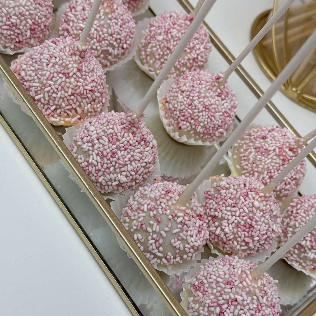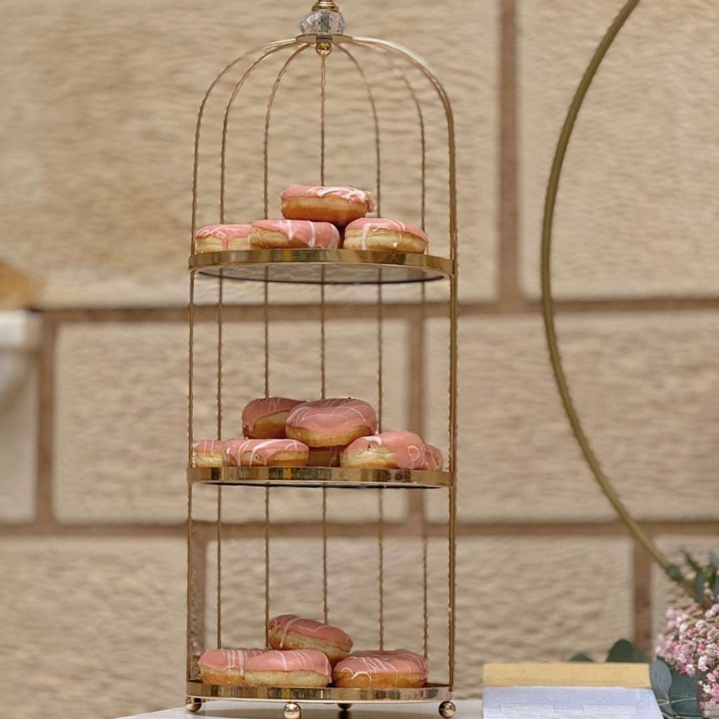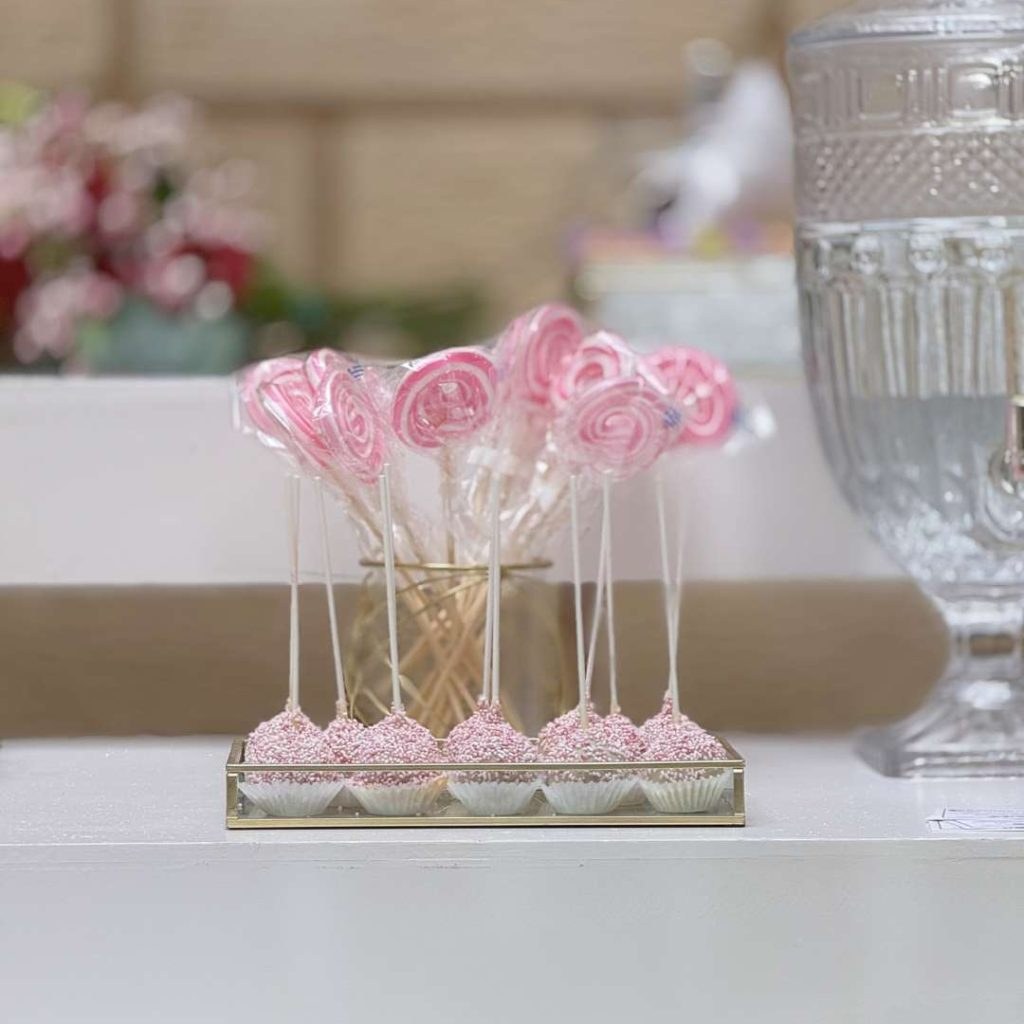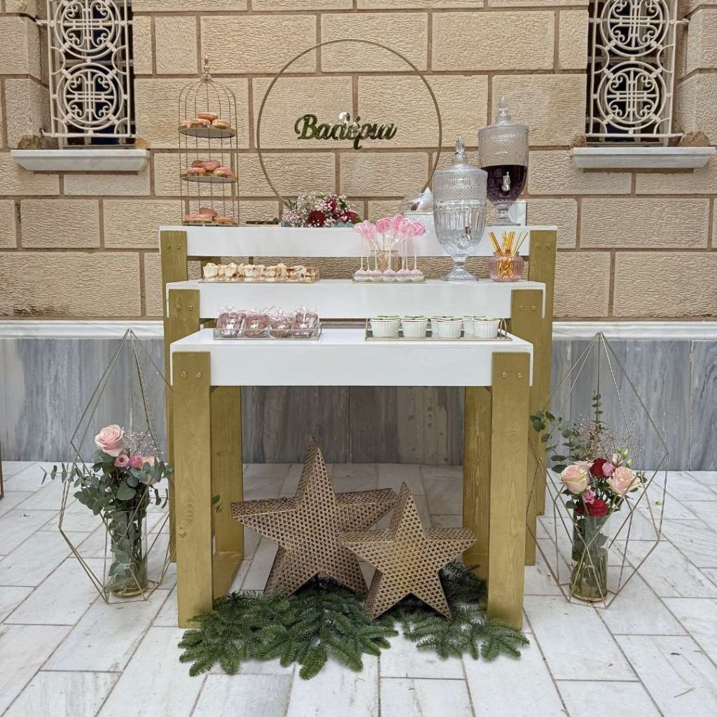 Το candy bar της βάπτισης ήταν αληθινή έκρηξη χαράς! Τρία λευκοχρυσά επίπεδα φιλοξενούσαν παραμυθένια γλυκίσματα όπως cake pops, μπισκότα, ντόνατς και cupcakes, ενώ τα αστέρια μπροστά από το candy bar έδωσαν μια πινελιά διαχρονικότητας και μοντέρνας διακόσμησης. Όλα τα γλυκά ήταν διακοσμημένα σε αποχρώσεις blush – μπορντό – χρυσό, δένοντας με το γενικό εορταστικό concept.