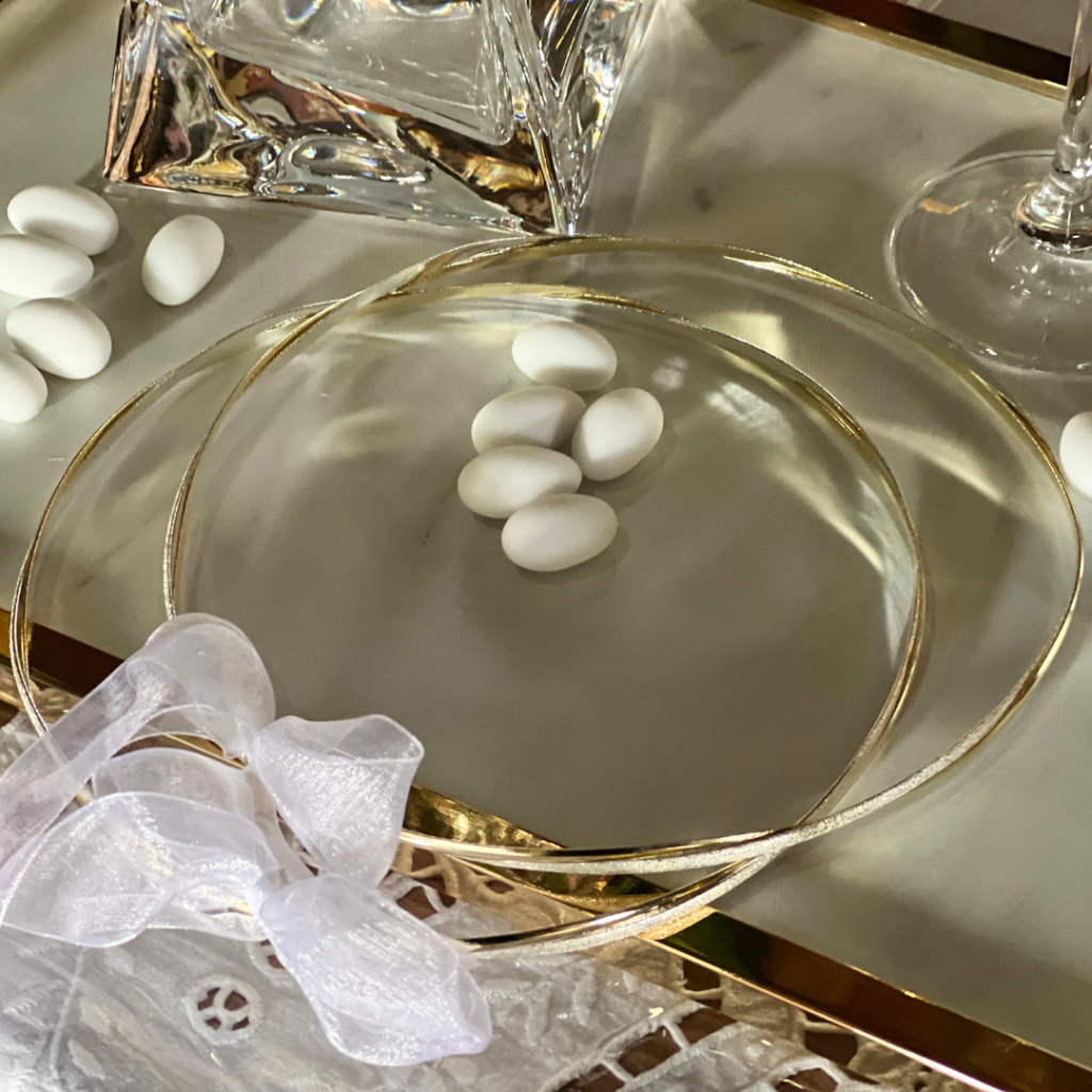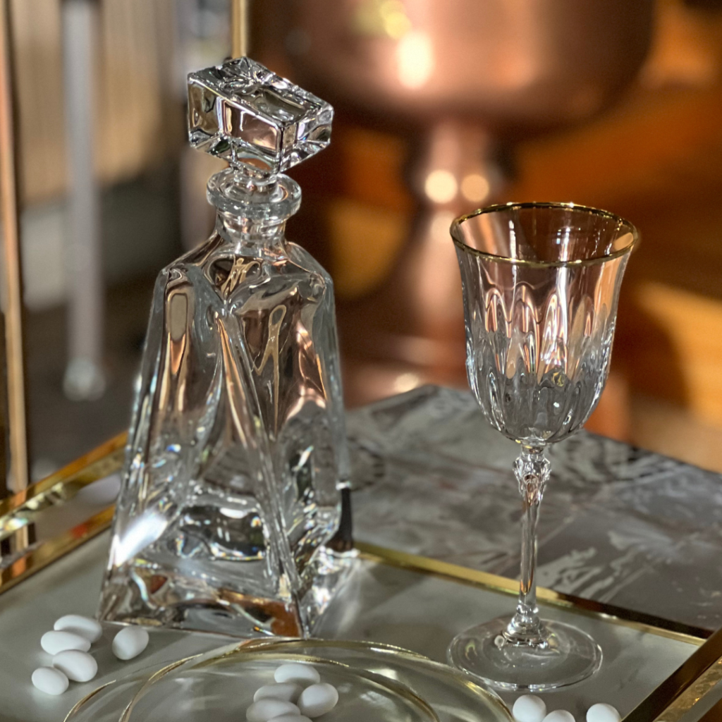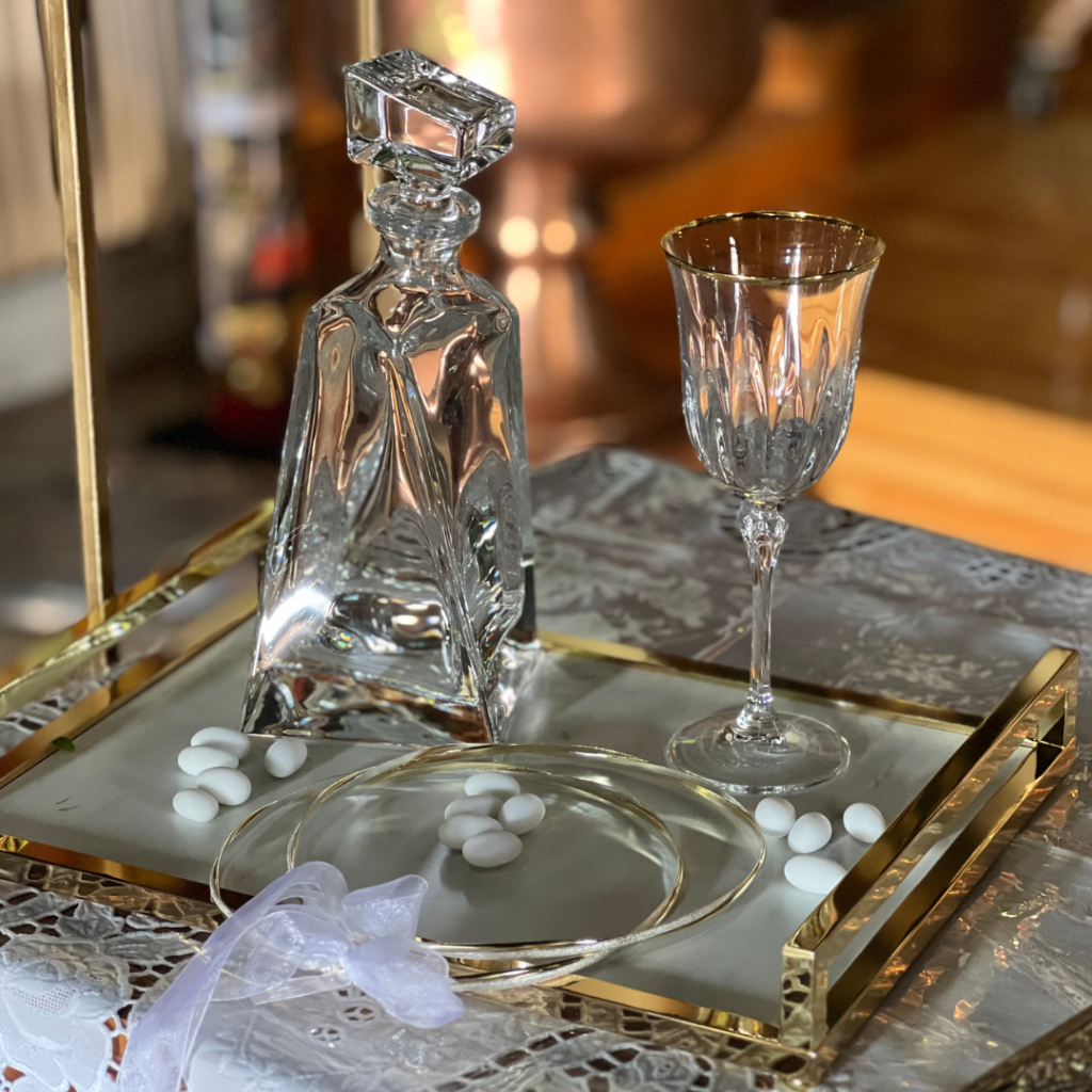 Το σετ κουμπάρου, με το ποτήρι και την καράφα από κρύσταλλα Βοημίας, αλλά και τα στέφανα από χρυσό και ασήμι, αποτέλεσαν ένα ξεχωριστό ενθύμιο από τον κουμπάρο προς τους νεόνυμφους!