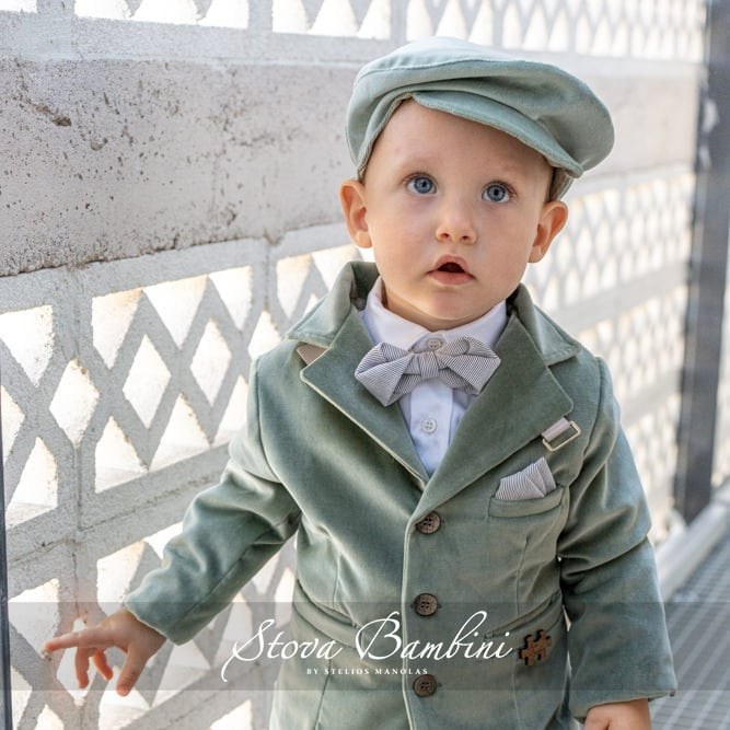 To Βαπτιστικό Κοστούμι Β3 AW22-23 της Stova Bambini είναι το κοστούμι 7 τεμαχίων, με ολοκαίνουριο σχέδιο σακάκι, με leather like κούμπωμα και γιακά μάο, ενώ ανοιχτό θυμίζει την αγαπημένη κλασσική γραμμή του σακακιού Stova Bambini. Η απόχρωση του είναι το πράσινο λαδί, ενώ το σύνολο ολοκληρώνεται από γιλέκο στην ίδια απόχρωση με το σακάκι και μπεζ βαμβακερό παντελόνι. Έχει λευκό βαμβακερό πουκάμισο και στο σετ περιλαμβάνεται υπέροχο ριγέ παπιγιόν, ασορτί τιράντες και λαδί τραγιάσκα.