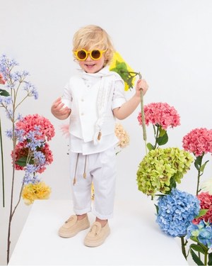Το accessorizing στη νέα αυτή συλλογή λειτουργεί ως το τελικό στάδιο μιας προσεκτικά δομημένης σκηνογραφίας, προσθέτοντας στρώσεις κομψότητας και χαρακτήρα. Η αντικατάσταση του παραδοσιακού παπιγιόν με μακριά αέρινα φουλάρια-μπαντάνες, διακοσμημένα με Baroque, Toile de Jouy ή ethnic μοτίβα, προσδίδει μια κίνηση και ένα βάθος στη συνολική εικόνα, το οποίο είναι εξαιρετικά photogenic και ιδανικό για editorial παρουσιάσεις σε blogs και social media. Το λευκό ψάθινο καπέλο τύπου Panama, εμπλουτισμένο με σχοινένιες λεπτομέρειες, δερμάτινες κορδέλες και διακριτικές φούντες, ολοκληρώνεται ως το απόλυτο σύμβολο μιας "Bohemian Aristocracy", η οποία συνδυάζει την παιδική ανεμελιά με την εκλέπτυνση. Αυτή η σπουδή στις λεπτομέρειες είναι που καθιστά την αναζήτηση για χειροποίητα βαπτιστικά ρούχα για αγόρι μια διαδικασία επιλογής ενός ολοκληρωμένου concept στυλ και όχι απλώς ενός μεμονωμένου συνόλου.