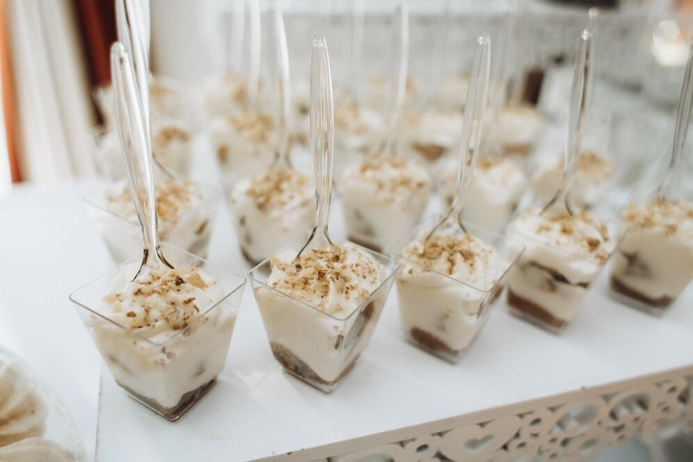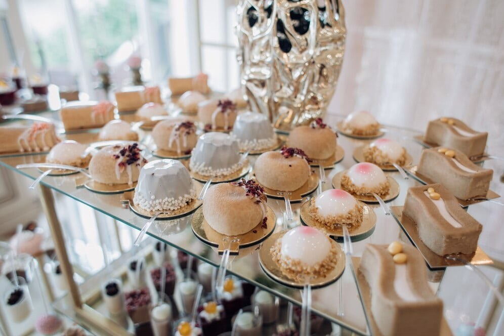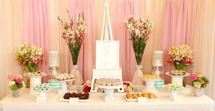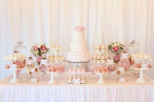 Σε περίπτωση που το θέμα του γάμου είναι πιο ρομαντικό, μπορείτε να έχετε γυάλινα τραπέζια και πιάτα, και γλυκά σε λευκά και παστέλ χρώματα.
