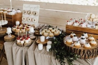 Τονίστε την ήρεμη ατμόσφαιρα με τη γοητευτική διακόσμηση των candy bars. Προσδώστε γήινους και φυσικούς τόνους για γάμους εμπνευσμένους από τη φύση. Μπορείτε να κρεμάσετε τα φώτα σε κλαδιά δέντρων, να τοποθετήσετε το φαγητό σε πλάκες αντί για πιάτα και να έχετε κοντά ξύλινα παγκάκια ή τραπέζια για να τα κρατάτε ψηλά. Συμπληρώστε το φόντο με το πράσινο χρώμα της φύσης.