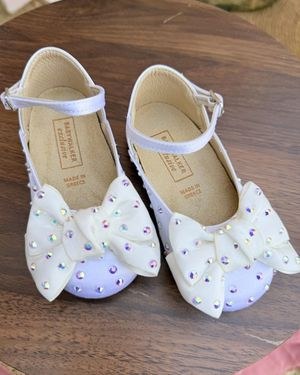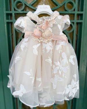 Το βαπτιστικό φόρεμα της Ρεγγίνας – πολυστρωματικό, σε απαλό nude, με λευκές κεντημένες πεταλούδες και λουλουδένιες εφαρμογές – αντιμετωπίζεται σχεδιαστικά ως προέκταση του σκηνικού. Τα κεντήματα και οι ανάγλυφες λεπτομέρειες επαναλαμβάνουν τα μοτίβα που συναντά κανείς στα πάνελ και στα διακοσμητικά στοιχεία, επιτρέποντας στο σώμα του παιδιού να «διαβάζεται» ως κινητό στοιχείο της εγκατάστασης. Παράλληλα, τα παπουτσάκια με τους ογκώδεις φιόγκους και τα διαφανή στρας ενισχύουν τη στιλιστική συνέχεια, εισάγοντας μία νότα παιχνιδιάρικου glamour που συνομιλεί με τις γυαλιστερές επιφάνειες των μπαλονιών και των metallic επιγραφών. Η συντονισμένη αυτή σχέση ανάμεσα στο outfit και στον χώρο εναρμονίζεται με σύγχρονες πρακτικές «holistic styling» σε βαπτίσεις, όπου το ένδυμα δεν επιλέγεται αποκομμένα αλλά ως αναπόσπαστο τμήμα της συνολικής χωρικής εμπειρίας.