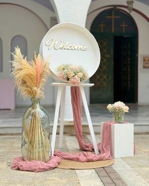 Η διάταξη της βάπτισης της Ρεγγίνας ακολουθεί μια ξεκάθαρη χωρική ιεραρχία, η οποία δομεί την εμπειρία των καλεσμένων σε διαδοχικά επεισόδια. Η welcome γωνιά στην είσοδο του ναού λειτουργεί ως πρώτο «κατώφλι» (threshold), όπου ο επισκέπτης συναντά το θέμα σε συμπυκνωμένη μορφή: ένας λευκός κυκλικός δίσκος με την επιγραφή “Welcome”, συνδυασμένος με pampas grass σε μεγάλο γυάλινο δοχείο και μαλακά ροζ υφάσματα που «ρέουν» στο δάπεδο. Η σύνθεση αυτή δηλώνει ήδη τις βασικές λέξεις‑κλειδιά του concept: απαλότητα, κίνηση, ρομαντισμός. Στη συνέχεια, ο βασικός σκηνικός άξονας συγκροτείται γύρω από το candy bar βάπτισης – backdrop σύμπλεγμα. Πάνελ σε διαφορετικά ύψη, οργανικές μπαλονοσυνθέσεις και το όνομα της Ρεγγίνας σε μεταλλική, γυαλιστερή γραφή συγκρότησαν ένα σημείο που κερδίσε τις εντυπώσεις όλων των καλεσμένων. Η τοποθέτηση ψάθινης πολυθρόνας μπροστά από τα πάνελ – πλαισιωμένη από καλάθια με άνθη, υφάσματα και μπαλόνια, δημιούργησε μια προσωποκεντρική σκηνή: είναι ο «θρόνος» της μικρής, αλλά και χώρος για οικογενειακές φωτογραφίσεις.