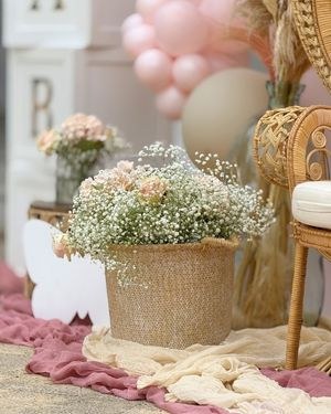 Στην κατασκευή των μπαλονιών, αξιοποιούνται εξειδικευμένες τεχνικές μπαλονοσύνθεσης, με ποικιλία διαμέτρων και διαβαθμίσεις ροζ, blush, κρεμ και soft mauve, δημιουργώντας μια σύνθεση που λειτουργεί περισσότερο ως γλυπτική χειρονομία παρά ως απλή διακόσμηση. Ο όγκος τους χρησιμοποιείται για να πλαισιώσει τα πάνελ, να οριοθετήσει τον χώρο του candy bar και να υπογραμμίσει τη θέση της ψάθινης πολυθρόνας, επιτυγχάνοντας σαφή οπτική ιεραρχία. Ο ανθοστολισμός, από την άλλη, παραμένει συνειδητά «ελαφρύς», με μικρές συνθέσεις από γυψοφίλη, απαλές ροζ και nude ροζέτες, τοποθετημένες σε απλά δοχεία και καλαθάκια. Η επιλογή αυτή αποφεύγει τον ανταγωνισμό με τον ήδη έντονο όγκο των μπαλονιών και των υφασμάτων, προσφέροντας σημεία ηρεμίας μέσα στον χώρο. Οι αποχρώσεις των λουλουδιών συντονίζονται με την παλέτα του foyer και του candy bar, εξασφαλίζοντας συνοχή.