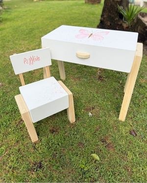Ιδιαίτερο ενδιαφέρον παρουσιάζει το σετ βάπτισης της Ρεγγίνας, το οποίο συνίσταται σε ξύλινο γραφειάκι και καρεκλάκι, βαμμένα σε λευκό με φυσικά ξύλινα πόδια και διακοσμημένα με ζωγραφισμένη πεταλούδα και το όνομα του παιδιού. Η επιλογή ενός αντικειμένου με μελλοντική χρηστική αξία ακολουθεί μια σύγχρονη τάση στο event design, όπου το βασικό τελετουργικό αντικείμενο σχεδιάζεται εξαρχής ως «μετα‑event» στοιχείο, ικανό να ενταχθεί στη μετέπειτα καθημερινότητα του παιδιού. Το σετ αυτό αποτελεί, ουσιαστικά, μικρογραφία του συνολικού concept: η καθαρότητα των γραμμών, η περιορισμένη παλέτα και η διακριτική παρουσία της πεταλούδας συμπυκνώνουν σε μικρή κλίμακα όσα συμβαίνουν σε μεγαλύτερη κλίμακα στο candy bar και στο backdrop. Αντιμετωπίζεται επομένως όχι μόνο ως πρακτικό «κιβώτιο» των μυστηριακών αντικειμένων, αλλά και ως φορέας της συνολικής οπτικής ταυτότητας της βάπτισης.