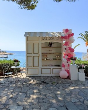 Μια ξύλινη κατασκευή που θυμίζει ιδανική βιτρίνα γαλλικού ζαχαροπλαστείου, με λευκές επιφάνειες και χρυσά περιγράμματα, συνδυάζεται με γιρλάντα μπαλονιών σε διαβαθμίσεις ροζ και λευκού. Στο εσωτερικό της, τα γλυκίσματα τοποθετούνται σε συμμετρικές στάθμες, όπως σε σκηνοθετημένη βιτρίνα.