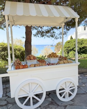 Δίπλα, ένα λευκό καρότσι παρουσιάζει αλμυρές και γλυκές επιλογές, οργανωμένες σε καθαρά γεωμετρικά διαμερίσματα. Η διαδρομή των καλεσμένων ακολουθεί φυσικά αυτή τη διάταξη: πρώτα η είσοδος και τα πρώτα φωτογραφικά στιγμιότυπα, στη συνέχεια η τελετή και, τέλος, η στάση στο patisserie corner, όπου η ατμόσφαιρα γίνεται πιο ανάλαφρη και κοινωνική.