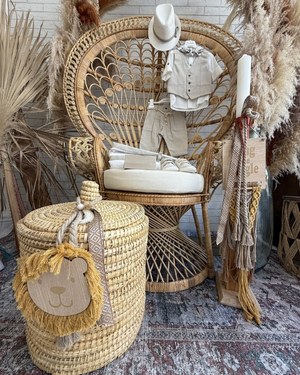 -Συνοδευτική διακόσμηση με ψάθινες λεπτομέρειες, καλάθια, υφασμάτινες σημαίες και τυπωμένα μοτίβα ζώων.