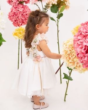 Από την πλευρά του fashion design, η Bambolino επιδεικνύει μια εξαιρετική διαχείριση των υφών. Η χρήση των αέρινων φτερών (feather detailing) προσδίδει μια «couture» αίσθηση κίνησης, η οποία είναι κρίσιμη για τη φωτογένεια του παιδιού. Οι στρώσεις από τούλι διαφορετικών πυκνοτήτων δημιουργούν βάθος πεδίου, ενώ οι τρισδιάστατες εφαρμογές λουλουδιών προσθέτουν μια γλυπτική διάσταση στα βαπτιστικά ρούχα κορίτσι.